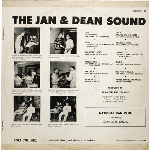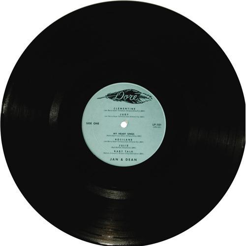 <B>Jan & Dean Autographed LP (Dore 101, 1960).</B></I> This copy of the hard-to-find LP doesn't have the photo that originally came with it, but it does have the duo's autographs on the front cover. There's tape along the top and bottom of the back cover. The record's in terrific shape. Condition: EX 7/ MT 9. <I>LOA from the Rockin' Rev Collection.</B></I><BR><BR><b>Shipping:</b> Recordings (<a target="_blank" href="http://www.heritageauctions.com/common/shipping.php">view shipping information</a>)