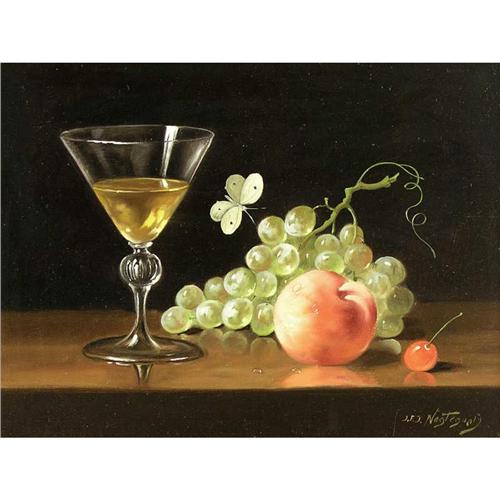 [Dutch 1920-2000] UNTITLED (STILL LIFE WITH WINE GLASS, FRUIT AND BUTTERFLY) Oil on panel 12 x 16 in.