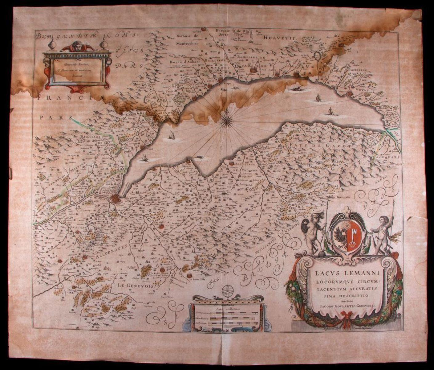 Artist: Jan Janszoon JANSSONIUS (1618-1657). Title: View of Burgundy. Size: 19 x 22 1/2 in. (paper size) Frame: no frame. Condition: tears along the border, staining and toning to paper. Created: c.1646. Medium: Hand colored engraving.