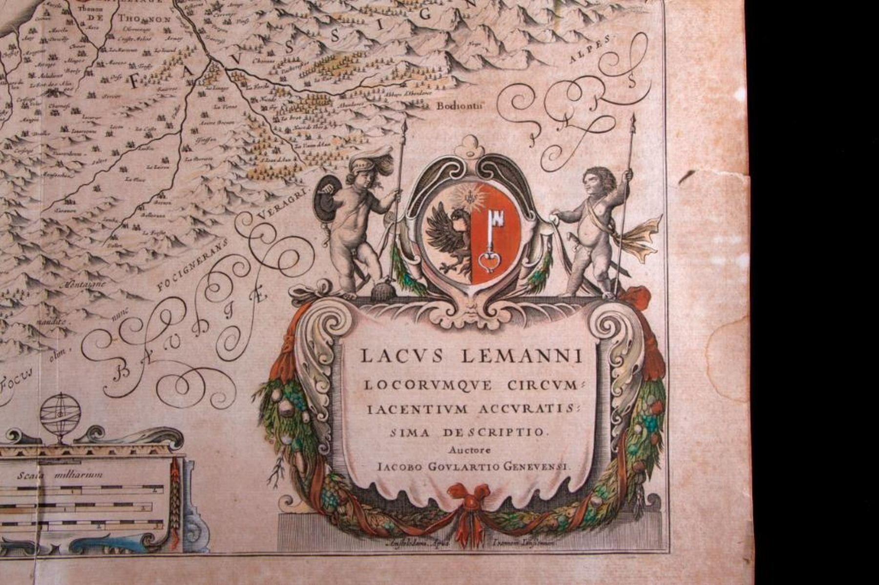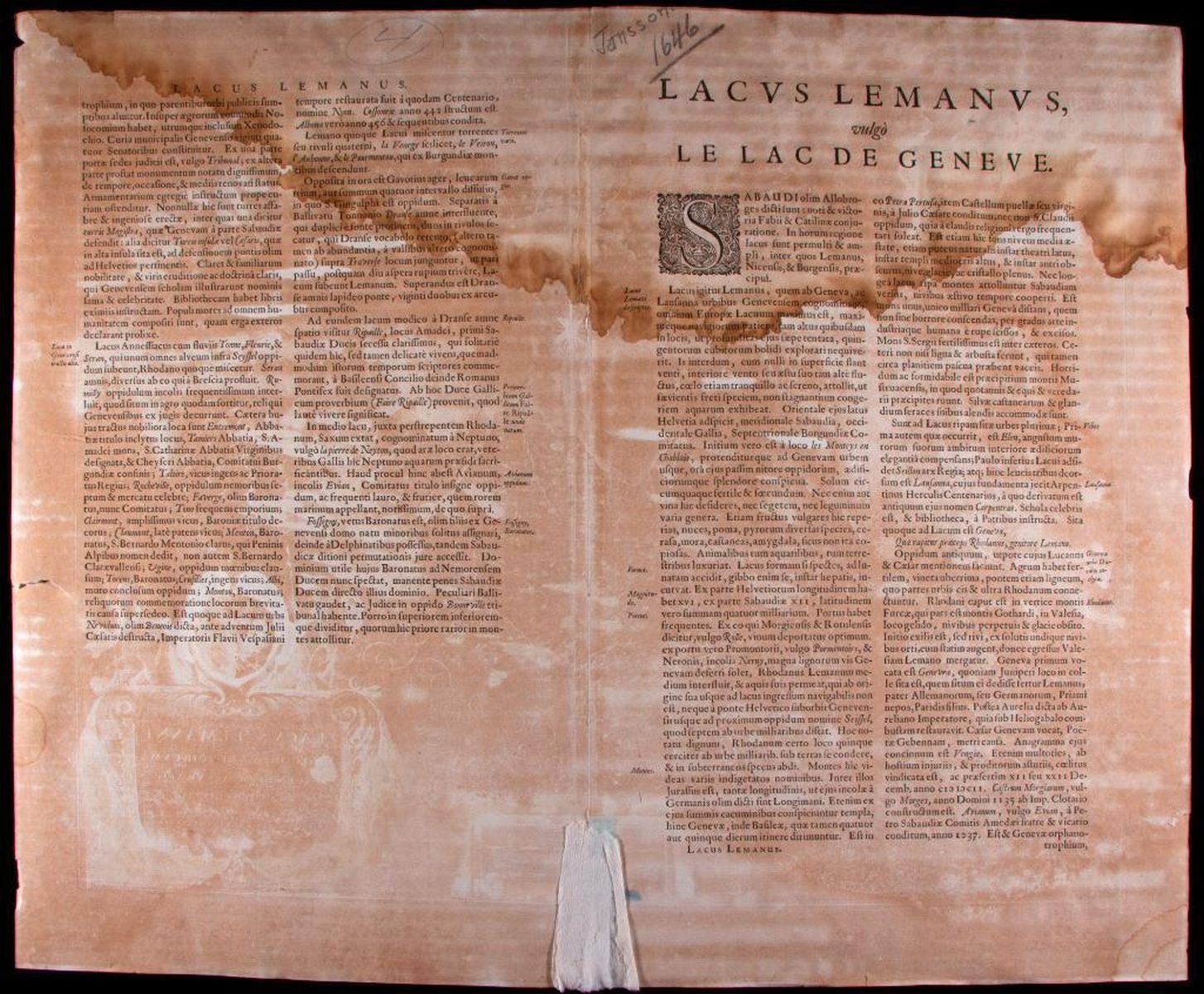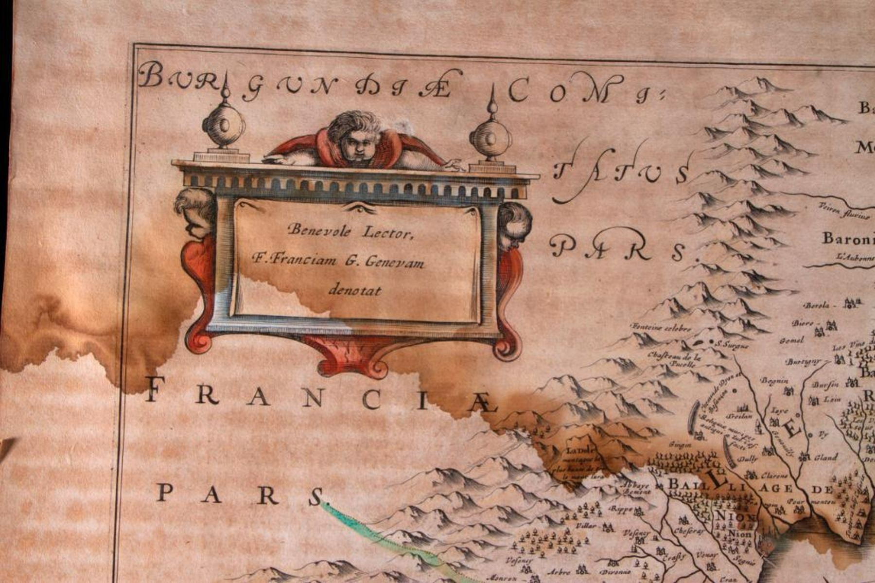 Artist: Jan Janszoon JANSSONIUS (1618-1657). Title: View of Burgundy. Size: 19 x 22 1/2 in. (paper size) Frame: no frame. Condition: tears along the border, staining and toning to paper. Created: c.1646. Medium: Hand colored engraving.