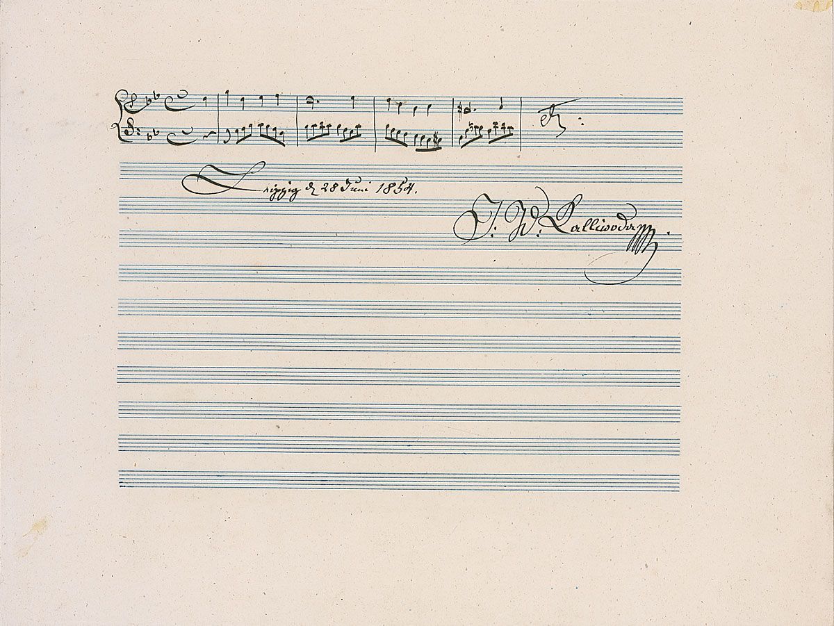 Choice AMQS on an off-white 10.5 x 8 musically-lined sheet. Kalivoda pens five bars from one of his works for piano, boldly signing below in German, “J. W. Kalliwoda,” and dating it June 28, 1854. In fine condition.