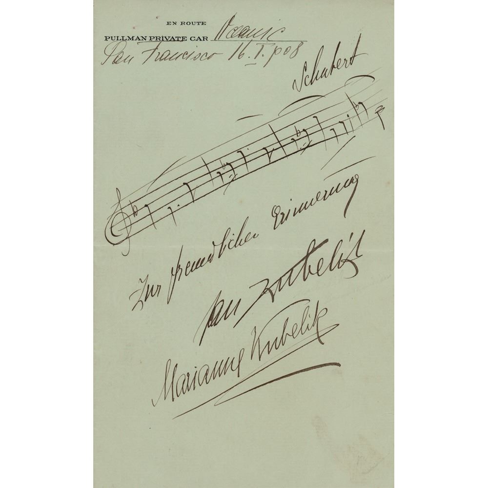 Enormously popular Czech-born violin virtuoso (1880-1940) AMQS on a 4.75 x 7.75 sheet of Pullman Private Car stationery, dated at San Francisco, January 16, 1908. Jan Kubelik pens four bars from a work by Schubert, prominently signed below in ink, "Jan Kubelik." Also signed by his wife, "Marianne Kubelik." In fine condition, with a tiny tear to the lower right edge.