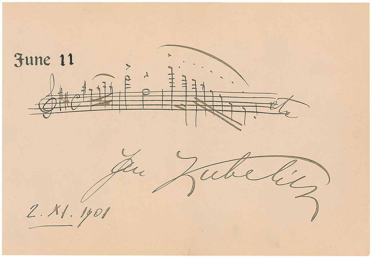 Enormously popular Czech-born violin virtuoso (1880–1940). AMQS on an off-white 7 x 5 album page dated June 11. Kubelik beautifully pens the first three bars of Paganini’s Violin Concerto No. 1 in D, signing below, “Jan Kubelik, 2.XI.1901.” In fine condition, with a light uniform shade of toning. Accompanied by an original unsigned postcard photo of Kubelik.