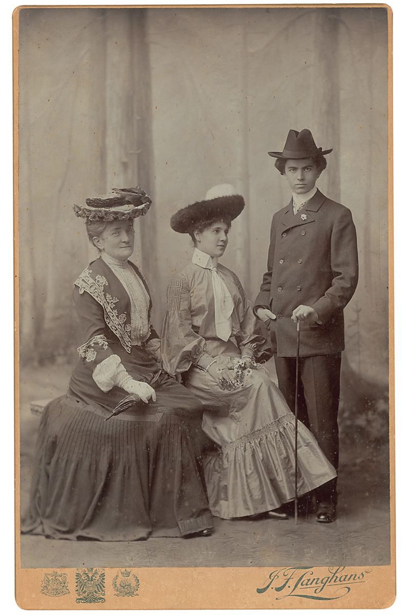 Enormously popular Czech-born violin virtuoso (1880–1940). Uncommon oversized 5.25 x 8.5 boudoir cabinet photo of Kubelik posing with two women, most likely his new wife Countess Czaky Szell and perhaps her mother by J. F. Langhans, blindstamped in the lower right “1903.” Some light spotting to image, ding to lower right corner tip, and a few surface marks, otherwise fine condition.