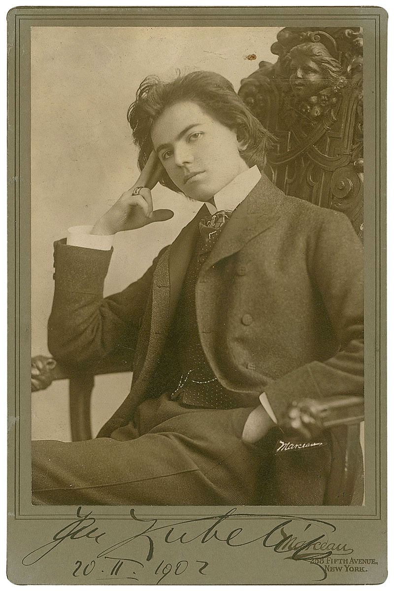 Enormously popular Czech-born violin virtuoso (1880–1940). Scarce 4.5 x 6.75 cabinet portrait of the young violinist seated in an elaborately engraved chair, floridly signed in the lower border in fountain pen, “Jan Kubelik, 20–II–1902.” Published by Marceau of New York. In fine condition, with a few trivial surface marks. An exceptional example of Kubelik, signed at the age of twenty-two and in the very year he was awarded the gold medal by the Royal Philharmonic Society.