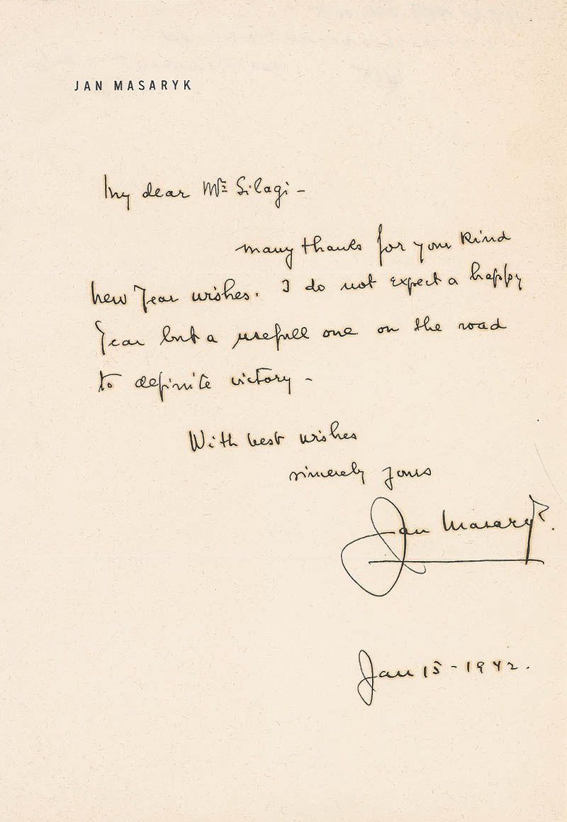Czech statesman (1886–1948) who served as the Czech Foreign Minister from 1940 until his death under mysterious circumstances. ALS, one page, 7.25 x 10.5, personal letterhead, January 15, 1942. In full: “Many thanks for your kind new year wishes. I do not expect a happy year but a usefull [sic] one on the road to definite victory.” Light overall toning and haloing to the ink, otherwise fine condition. Accompanied by the original mailing envelope.