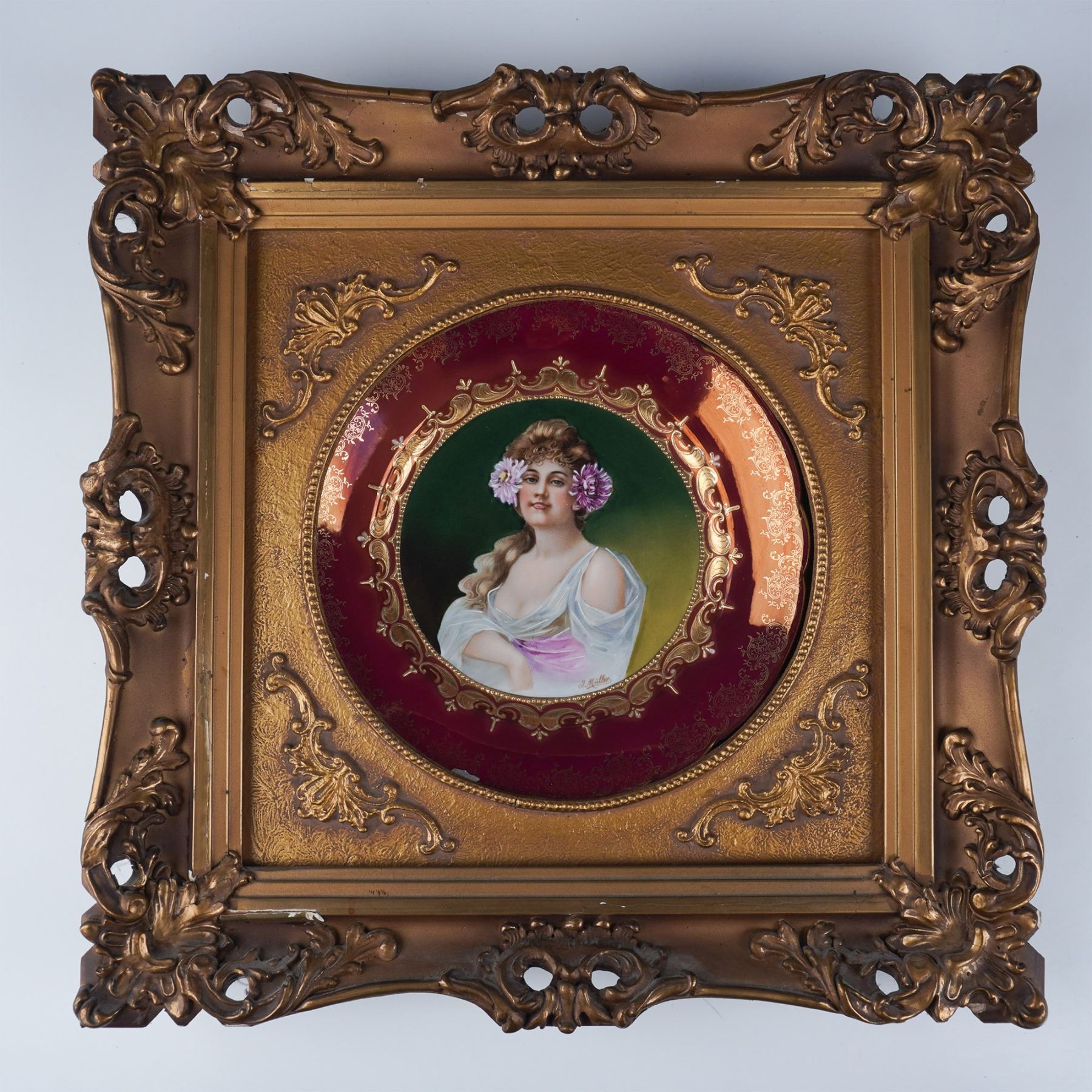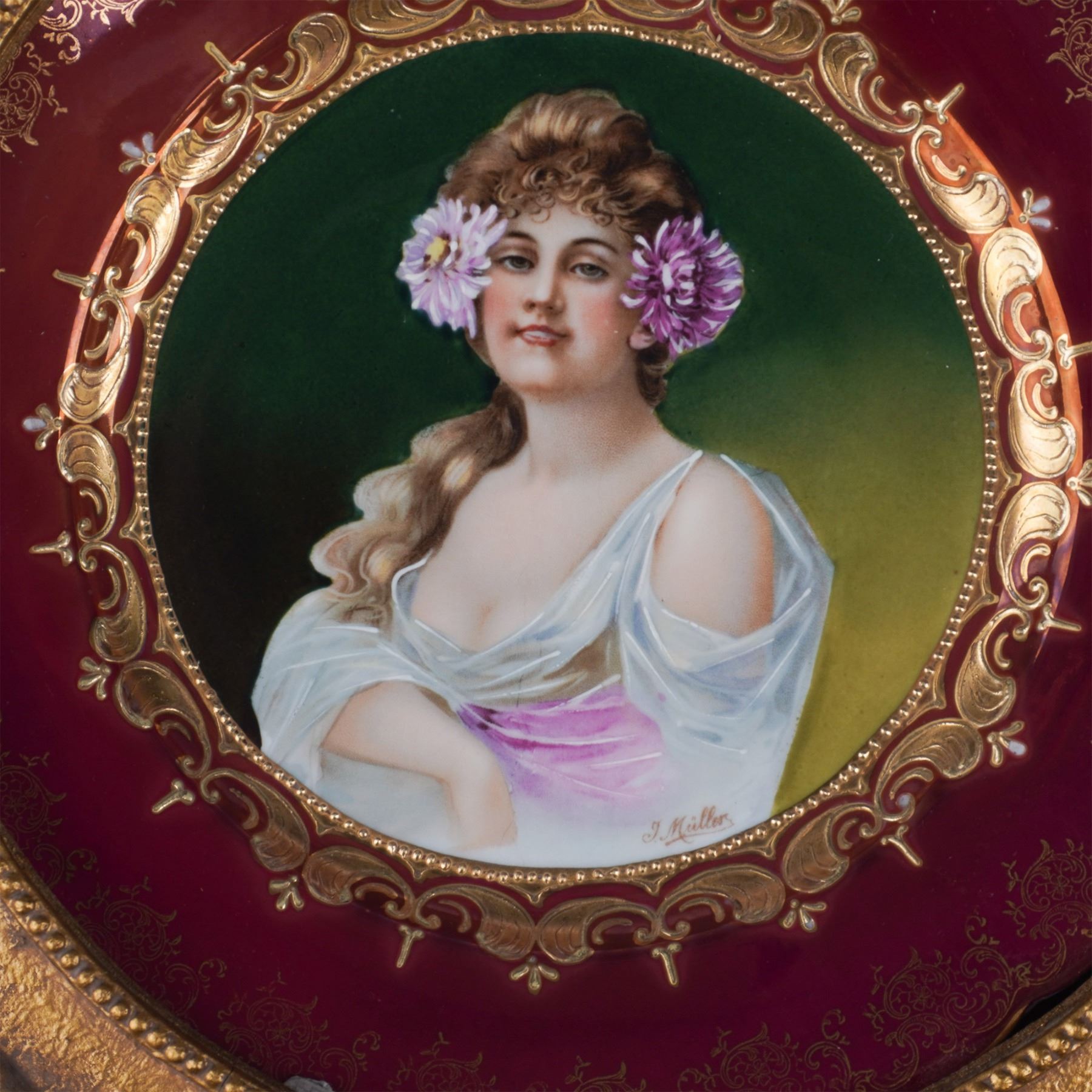 A finely hand-painted porcelain plaque depicting a neoclassical-style portrait of a young woman with flowing hair adorned with flowers. Signed by the artist J. Muller, this exquisite work is encircled by a deep burgundy border with elaborate gold scrollwork and embellishments. The artist works have been exhibited in institutions like the Whitney Museum and the Museum of Modern Art. The plaque is housed in an elaborate gilt frame featuring pierced rococo-style scrolls and decorative flourishes, enhancing its opulent aesthetic.