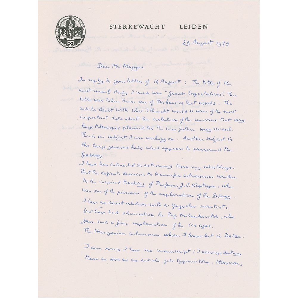 ALS signed “J. H. Oort,” one page both sides, 5.75 x 8.25, Leiden Observatory letterhead, September 29, 1979. In part: "The title of the most recent study I made was 'Great Expectations.' This title was taken from one of Dickens's last novels. The article dealt with what I thought would be some of the most important data about the evolution of the universe that very large telescopes planned for the near future may reveal. This is one subject I am working on. Another subject is the large gaseous halo which appears to surround the galaxy…I am sorry I have no manuscript; I always destroy them as soon as an article gets typewritten. However, I am enclosing a sheet with some computations concerning the density distribution in the Hyades cluster…Astronomy today seems to be in the most wonderful state of development, such as it has not known since the age of Kepler, Galilei and Newton." The sheet of calculations referenced is included. In fine condition.
