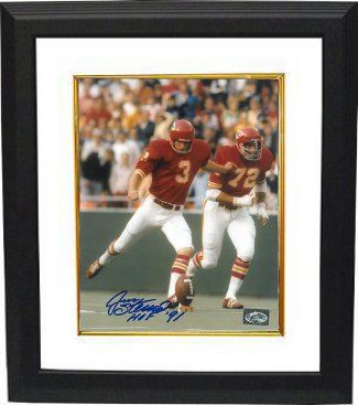 Jan Stenerud was one of the first professional football players to be used as a dedicated kicker, due to his excellent "sharpshooting" ball-kicking performance. He was one of the first placekickers to use the "soccer style". After the 1969 season, Stenerud won Super Bowl IV with the Chiefs when they defeated the Minnesota Vikings 23-7. Jan Stenerud has hand autographed this Kansas City Chiefs 8x10 Photo with HOF 91 Inscription. FI Holgoram and Certificate of Authenticity from Athlon Sports. Custom White Mat and Premium Black Frame as shown.