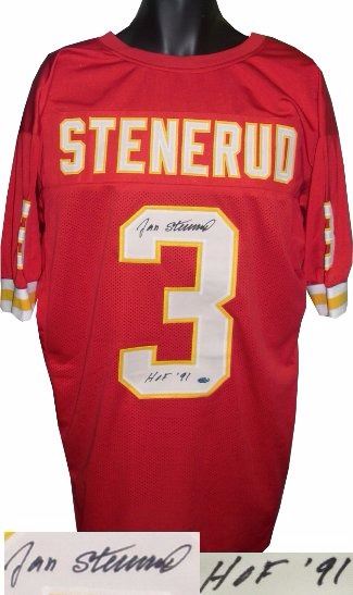 Jan Stenerud was one of the first professional football players to be used as a dedicated kicker, due to his excellent "sharpshooting" ball-kicking performance. He was one of the first placekickers to use the "soccer style". After the 1969 season, Stenerud won Super Bowl IV with the Chiefs when they defeated the Minnesota Vikings 23-7. Jan Stenerud has hand autographed this Kansas City Chiefs Red Prostyle jersey with HOF 1991 Inscription. Leaf Authentic Hologram and Certificate of Authenticity from Athlon Sports