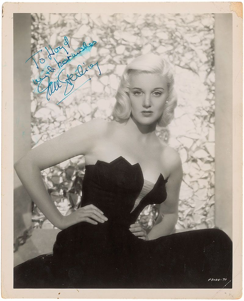 Vintage glossy 8 x 10 photo of the actress in a low-cut gown, signed and inscribed in blue ink “To Lloyd, with best wishes, Jan Sterling.” Scattered creases and surface marks, a couple brushes to inscription, and surface loss to top right corner, otherwise very good condition.