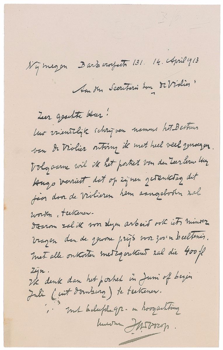 Dutch-Indonesian painter (1858–1928) who worked in various styles, including Symbolism and Art Noveau. ALS signed “J. Th. Toorop,” one page, 5.25 x 8.25, April 14, 1913. Untranslated letter concerning arrangements for his portrait of the Flemish priest and author Hugo Verriest. In fine condition, with trivial toning to left edge. The board of the Amsterdam Catholic artist's society ‘De Violier’ commissioned Toorop to make the portrait of Verriest, who was especially notable for his political activism in the Flemish Movement. He was a major advocate for emancipation and greater autonomy of the Belgian region of Flanders, for protection of the Dutch language, and for the protection of Flemish culture and history.