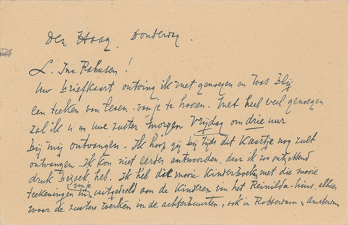 Dutch-Indonesian painter (1858–1928) who worked in various styles, including Symbolism and Art Noveau. Untranslated ALS in Dutch on both sides of a 5.5 x 3.5 postcard, postmarked September 3, 1925. In fine condition.
