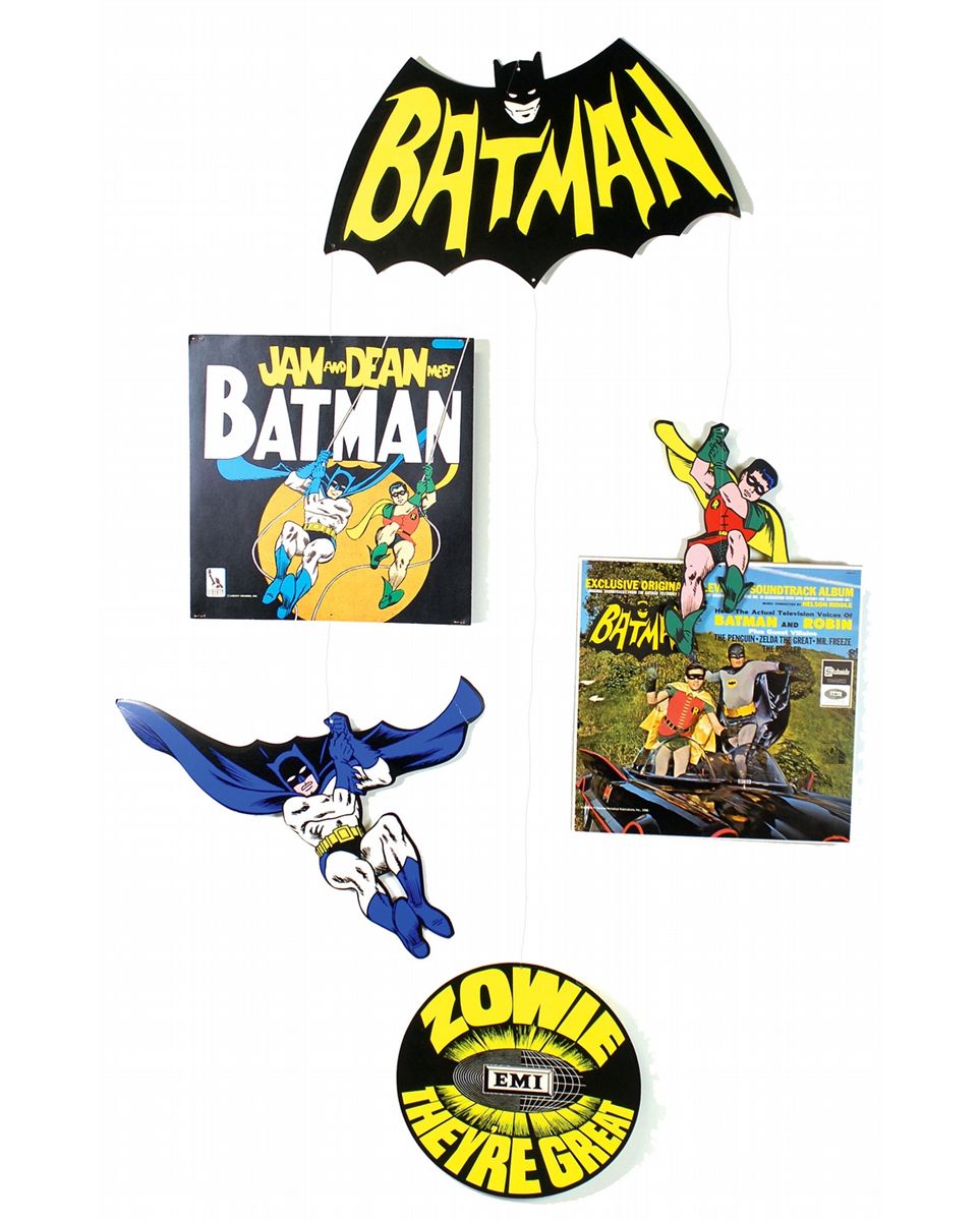 Original six-piece Batman Meets Jan and Dean hanging store display. All pieces are connected with a thin wire and feature Batman and Robin, two images of the soundtrack cover, and other graphics. In fine condition. A colorful and uncommon piece of memorabilia. Accompanied by a certificate of authenticity from Tracks.
