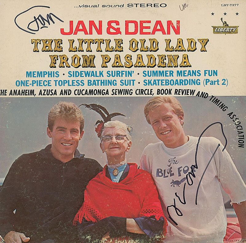 The Little Old Lady from Pasadena album, stamped on the reverse, “Audition Record,” signed on the front cover in black felt tip, “Jan” and “Dean.” In very good condition, with scattered wear and rubbing to covers, a small felt tip notation to front cover, and scattered foxing to both covers. The record is included. Accompanied by a full letter of authenticity from Roger Epperson/REAL.