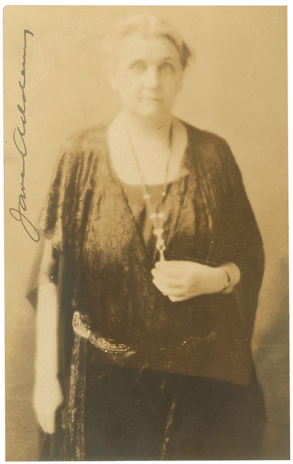 American social reformer (1860–1935) who shared the 1931 Nobel Peace Prize. Vintage 3.25 x 5.5 postcard photo, signed vertically in fountain pen. In fine condition, with mild silvering to lower portion of image. Accompanied by the original Hull House mailing envelope, postmarked June 15, 1931.