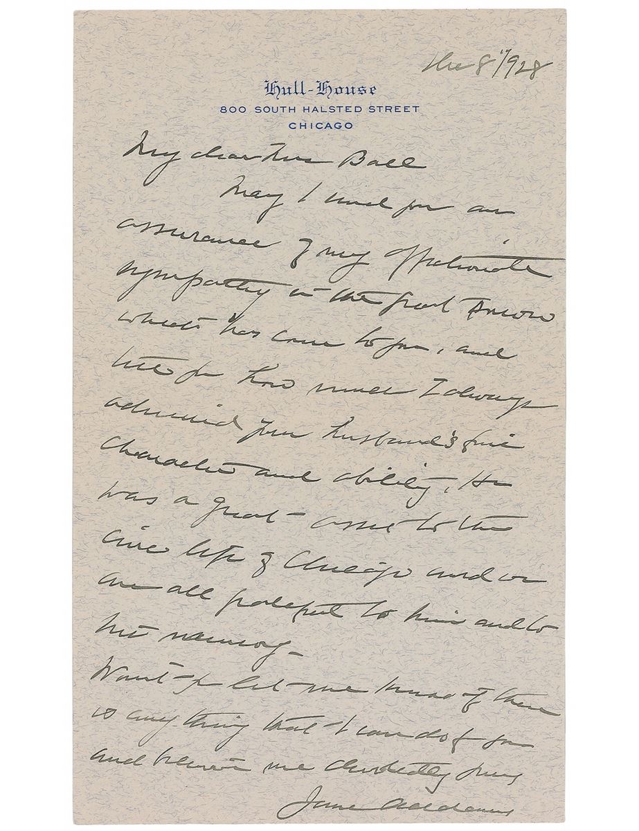 American social reformer (1860–1935) who became the first American woman to receive the Nobel Peace Prize in 1931. ALS, one page, 5.25 x 8.75, Hull House letterhead, November 8, 1928. Letter to Mrs. Ball, in part: “I always admired your husband’s fine character and ability. He was a great asset to the cine life of Chicago and we are all grateful to him and to his memory.” In fine condition.