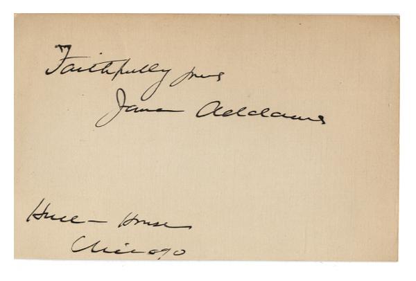Jane Addams (1860 – 1935). Founder of the U.S. Settlement House movement, and one of the first women to be awarded the Nobel Peace Prize. Card Signed. 5" x 3 1/4". "Faithfully yours, Jane Addams, Hull House, Chicago". Excellent.