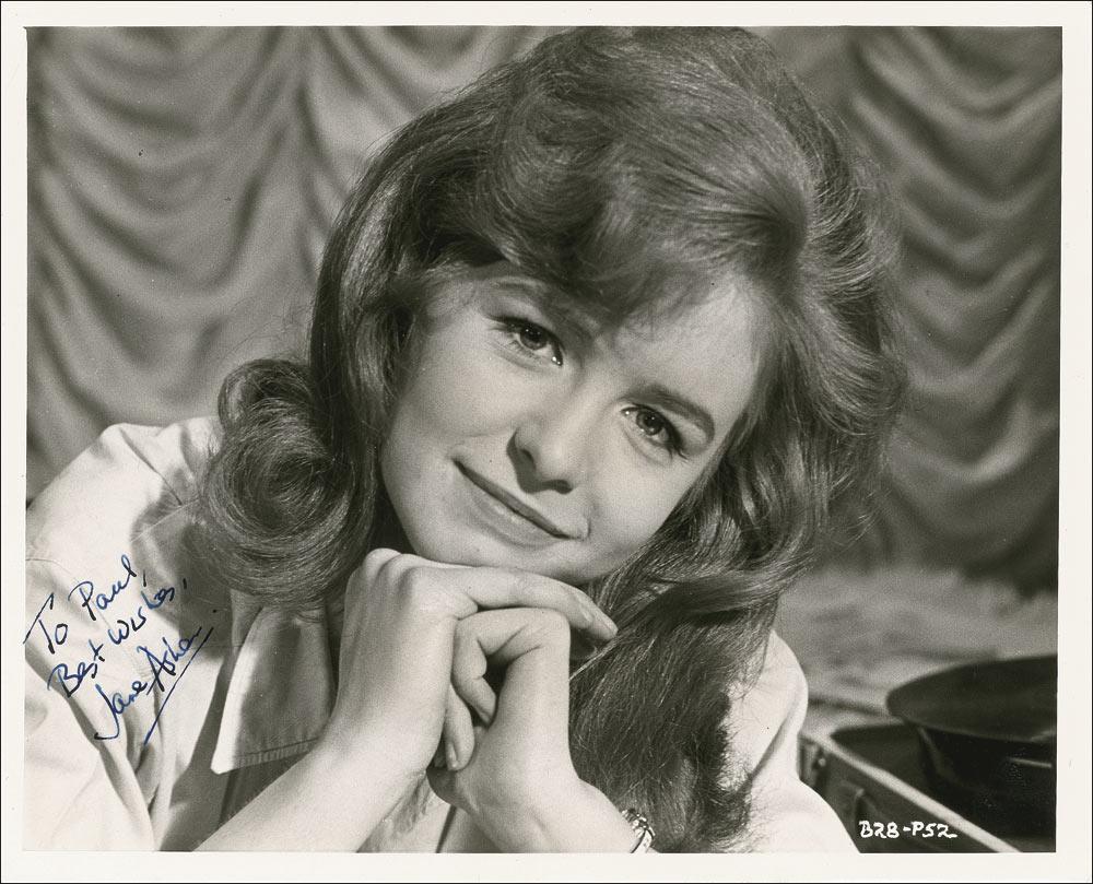 Vintage glossy 10 x 8 publicity photo of Asher as Lindy Birkett in the film The Nose on My Face, signed and inscribed in fountain pen “To Paul, Best wishes, Jane Asher.” Scattered light creases and surface marks, and some mild curling to edges from adhesive on reverse, otherwise fine condition. Pre-certified PSA/DNA and RRAuction COA.