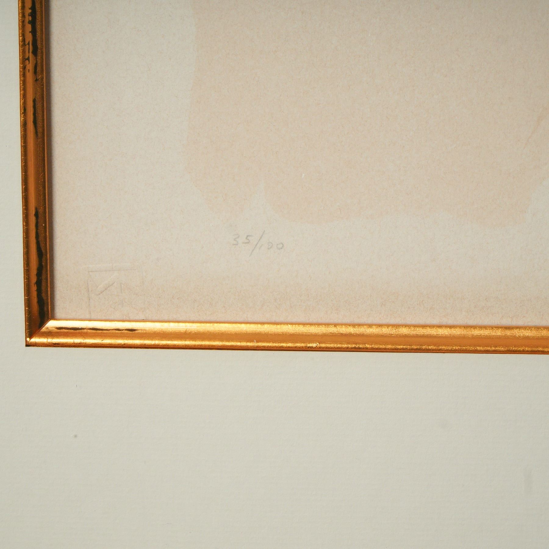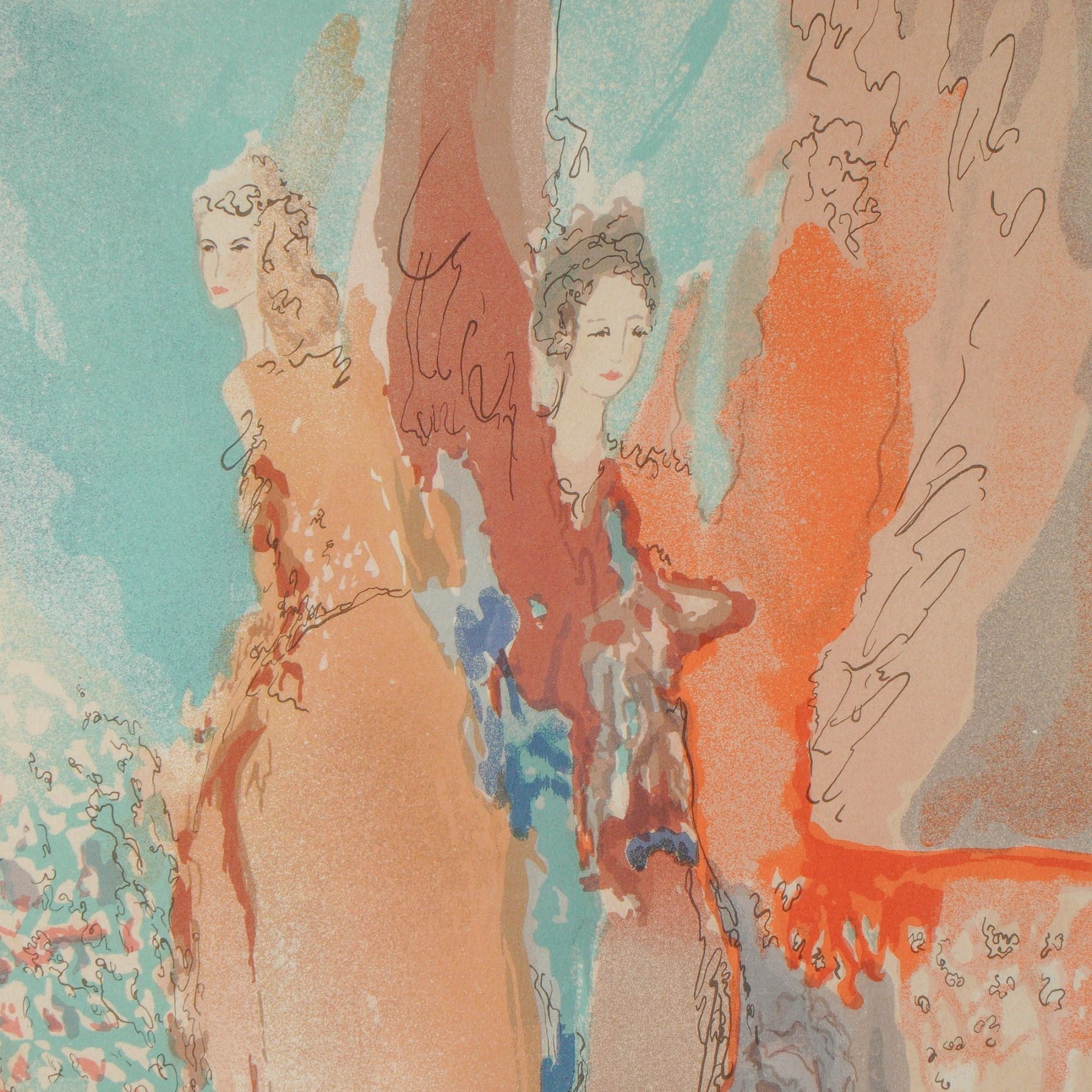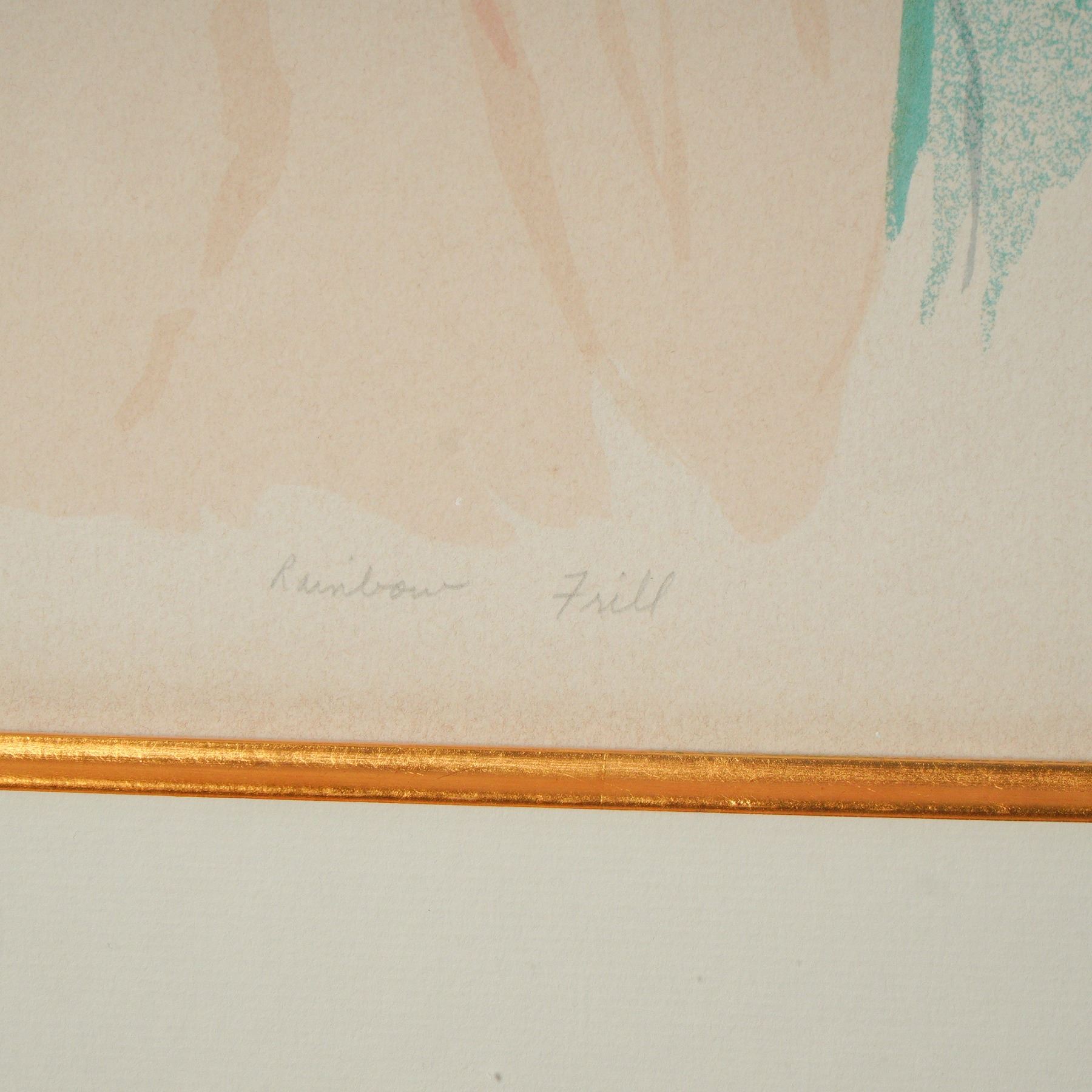 A dazzling example of Jane Bazinet's romantic and ethereal vision, Rainbow Frill is a limited edition lithograph executed in 1982, vibrantly capturing the artist's signature blend of dreamlike figures and color-rich abstraction. Rendered in soft peach, turquoise, and fiery coral tones, the composition presents two graceful female figures emerging from an atmospheric backdrop of cascading textures and delicate linework. The fluidity and femininity of the forms create an almost balletic motion, evoking a sense of whimsical elegance. Jane Bazinet is a celebrated American artist known for her delicate figuration, graceful lines, and distinctive use of color. Her work has been featured in numerous solo and group exhibitions across the United States, gaining acclaim for its emotional depth and lyrical style. She has worked extensively in watercolor, oil, and lithography, often exploring themes of femininity, movement, and the interplay of form and atmosphere. Signed and dated in graphite by the artist in the lower right, with the edition number 35/100 indicated at the lower left, this hand-pulled lithograph bears a blindstamp mark of authenticity in the margin. The work is handsomely presented in a gold-tone wood frame with archival matting and backing, ready to elevate any contemporary or modern interior.
