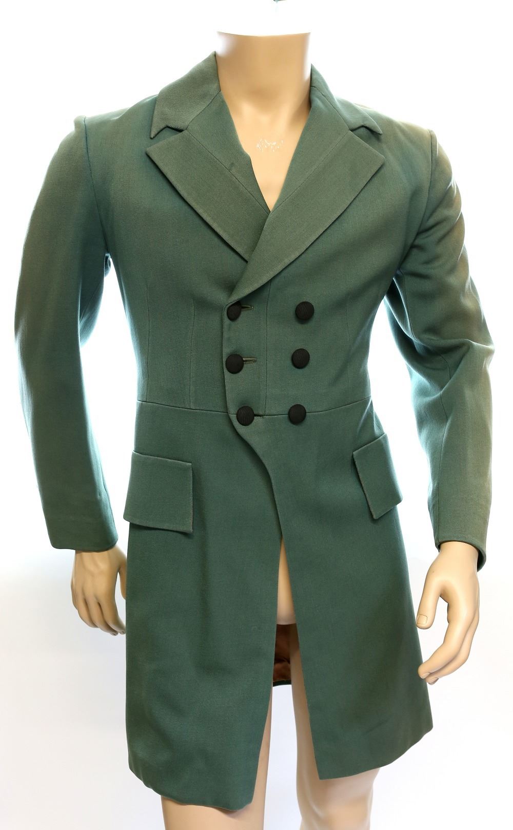 Jane Eyre (1934) - Colin Clive as Edward Rochester, production made green tailcoat jacket with black buttons and beige interior lining. Inscribed Western Costume Co label (39 1/2, 2, Colin Clive), stamp and barcode (40892158) within.