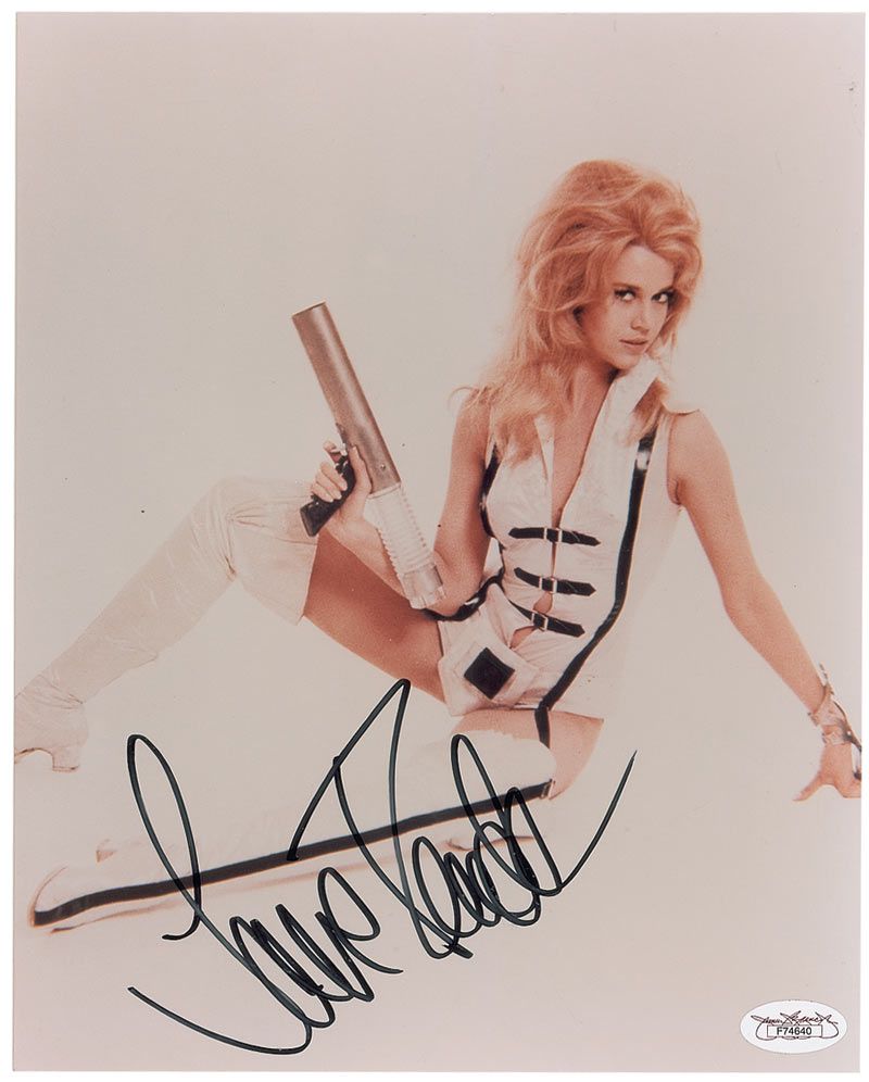 Color glossy 8 x 10 photo of Fonda as Barbarella, signed in black felt tip. In fine condition, with a James Spence authentication label affixed to lower corner.