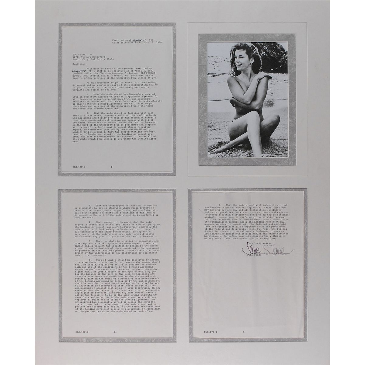 DS, signed “Jane S. Fonda,” three pages, 8.5 x 11, November 3, 1981. Loan out agreement between Fonda and ITC Films for an unidentified project. Signed on the last page in black felt tip by Fonda. Double-matted with a glossy photo of a discreetly-topless Fonda at the beach to an overall size of 21 x 26. A few vertical creases to last page, a couple lightly passing through first name of signature, otherwise fine condition. Oversized.