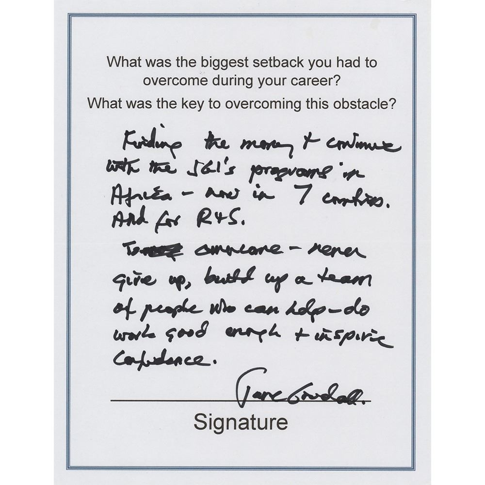 Handwritten statement signed "Jane Goodall," one page, 8.5 x 11, no date. Goodall responds to an inquiry about the greatest obstacle in her career, in part: "Finding the money to continue with the JGI's programs in Africa—now in 7 countries…To overcome—never give up, build up a team of people who can help—do work good enough to inspire confidence." In fine condition.
