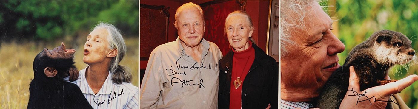 Three photos: a color glossy 10 x 8 photo of Jane Goodall interacting with a friendly chimpanzee, signed in black felt tip; a color glossy 10 x 8 close-up photo of David Attenborough holding an otter pup, signed in black felt tip; and a color satin-finish 10 x 8 photo of Goodall and Attenborough standing side-by-side, signed by both in black felt tip. In overall fine condition.