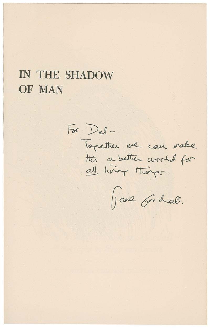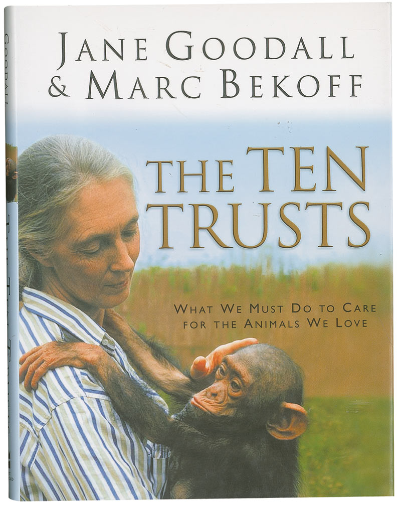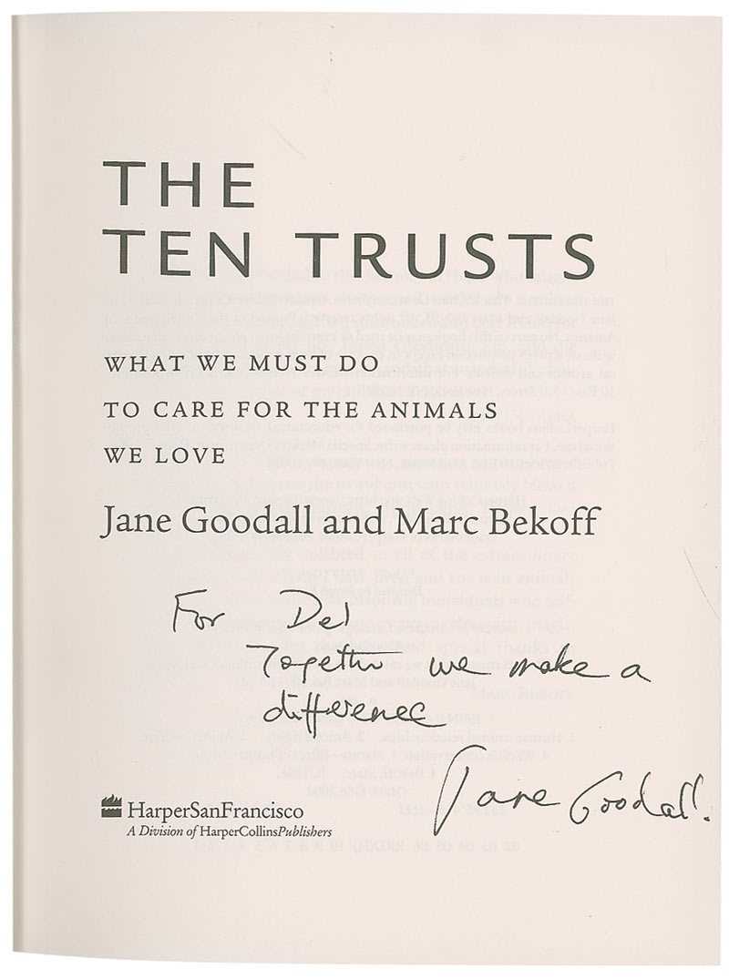 British primatologist best known for her decades-long studies of chimpanzee behavior. Two hardcover books: The Ten Trusts and In the Shadow of Man, each signed and inscribed on an interior page by Jane Goodall. In overall very good to fine condition.