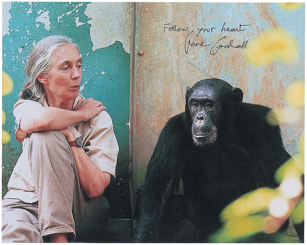Color satin-finish 10 x 8 photo of Goodall relaxing with a chimp companion, signed in black felt tip, “Follow your heart, Jane Goodall.” In fine condition.