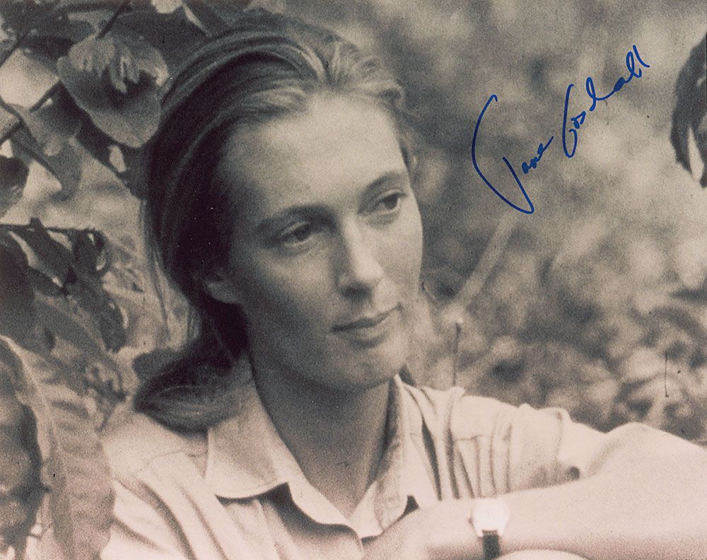 Satin-finish 10 x 8 photo of Goodall as a young primatologist, signed in blue felt tip. In very fine condition.