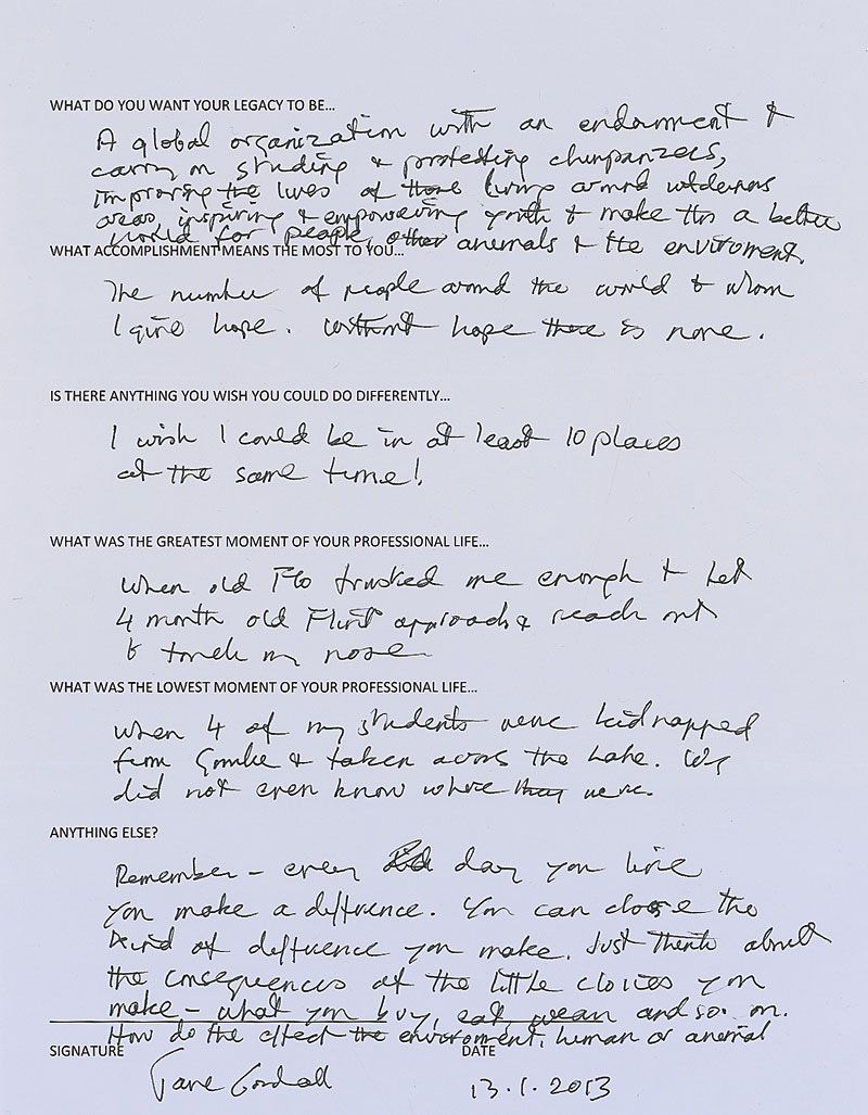 Questionnaire filled out by Goodall and signed at the conclusion, one page, 8.5 x 11, January 13, 2013. Goodall comments on her legacy, accomplishments, and professional life. She writes that she desires her legacy to be “a global organization with an endowment & carry on studying & protecting chimpanzees, improving the lives of those living around wilderness areas, inspiring & empowering youth to make this a better world for people, other animals & the environment.” She also describes the highlight of her career, “When Old Flo trusted me enough & let 4 month old Flint approach & reach out to touch my nose,” and the lowest moment of her professional life, “When 4 of my students were kidnapped from Gombe & taken across the lake. We did not even know where they were.” In fine condition. The kidnapping she references occurred in 1975, when four students studying with her in Tanzania were taken by a rebel leader and held for ransom; they were rescued when their families were able to raise nearly $500,000 to recover them. A fascinating and unique first person account from the world’s foremost primatologist, discussing numerous aspects of her life and career.