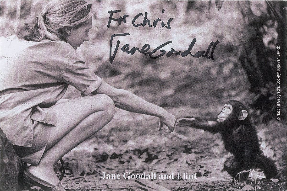 Two items: a color semi-glossy 14 x 11 cardstock photo of Goodall feeding a banana to a large chimpanzee, signed and inscribed in black felt tip, “For C. Williams—Follow your dreams, Jane Goodall”; and a Jane Goodall Institute information card showing Goodall and Flint the chimp, 6 x 4, signed and inscribed on the front in black felt tip, “For Chris, Jane Goodall.” In overall fine condition.