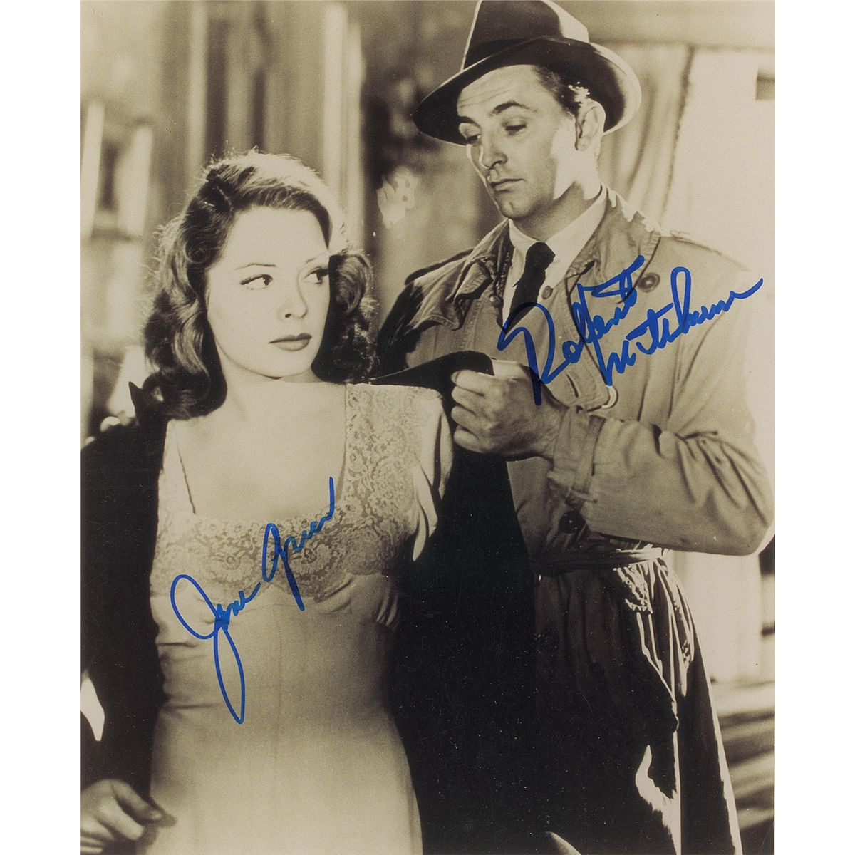 Glossy 8 x 10 photo of Greer and Mitchum from the 1947 film Out of the Past, signed in blue felt tip by both. In very fine condition.