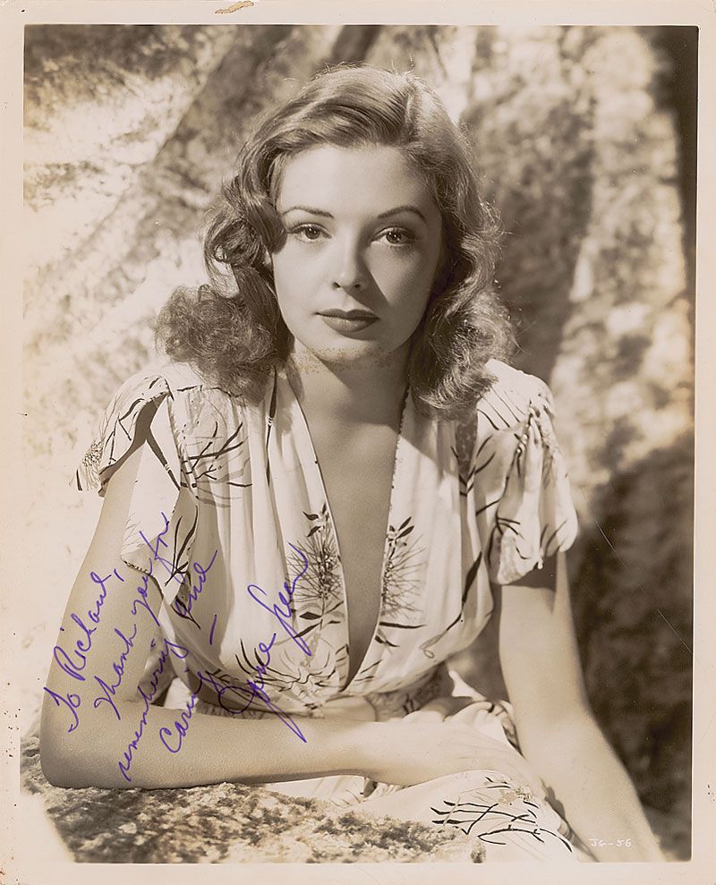 Attractive glossy 8 x 10 photo, signed and inscribed in purple fountain pen “To Richard, Thank you for remembering and caring—Jane Greer.” Scattered creases to image, some surface marks and impressions, and adhesive remnant to top edge, otherwise fine condition.