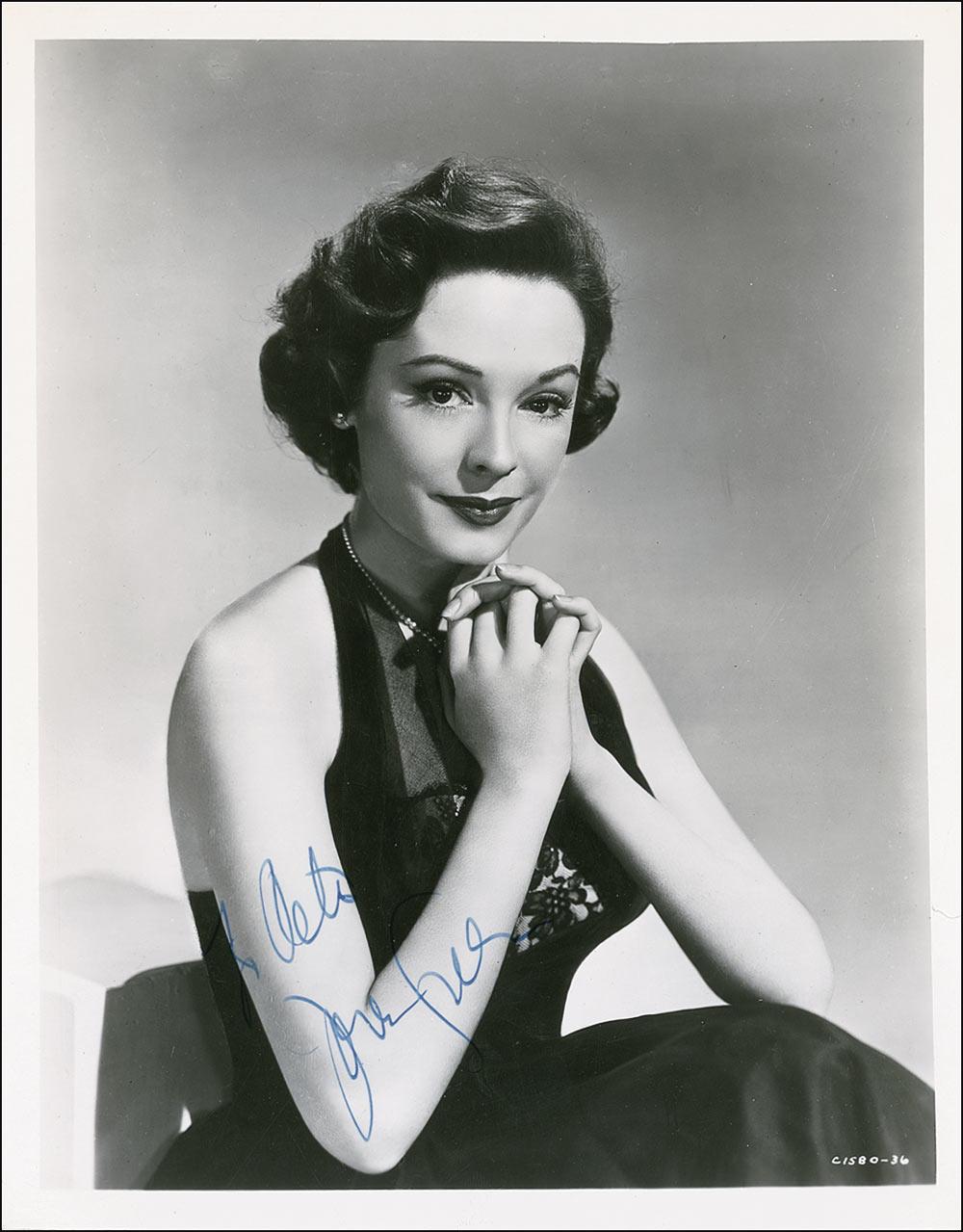 Attractive glossy 8 x 10 photo of Greer in a black dress, signed and inscribed in fountain pen. In fine condition, with some scattered light creases and surface marks, and a small tear to right edge.
