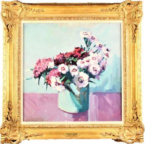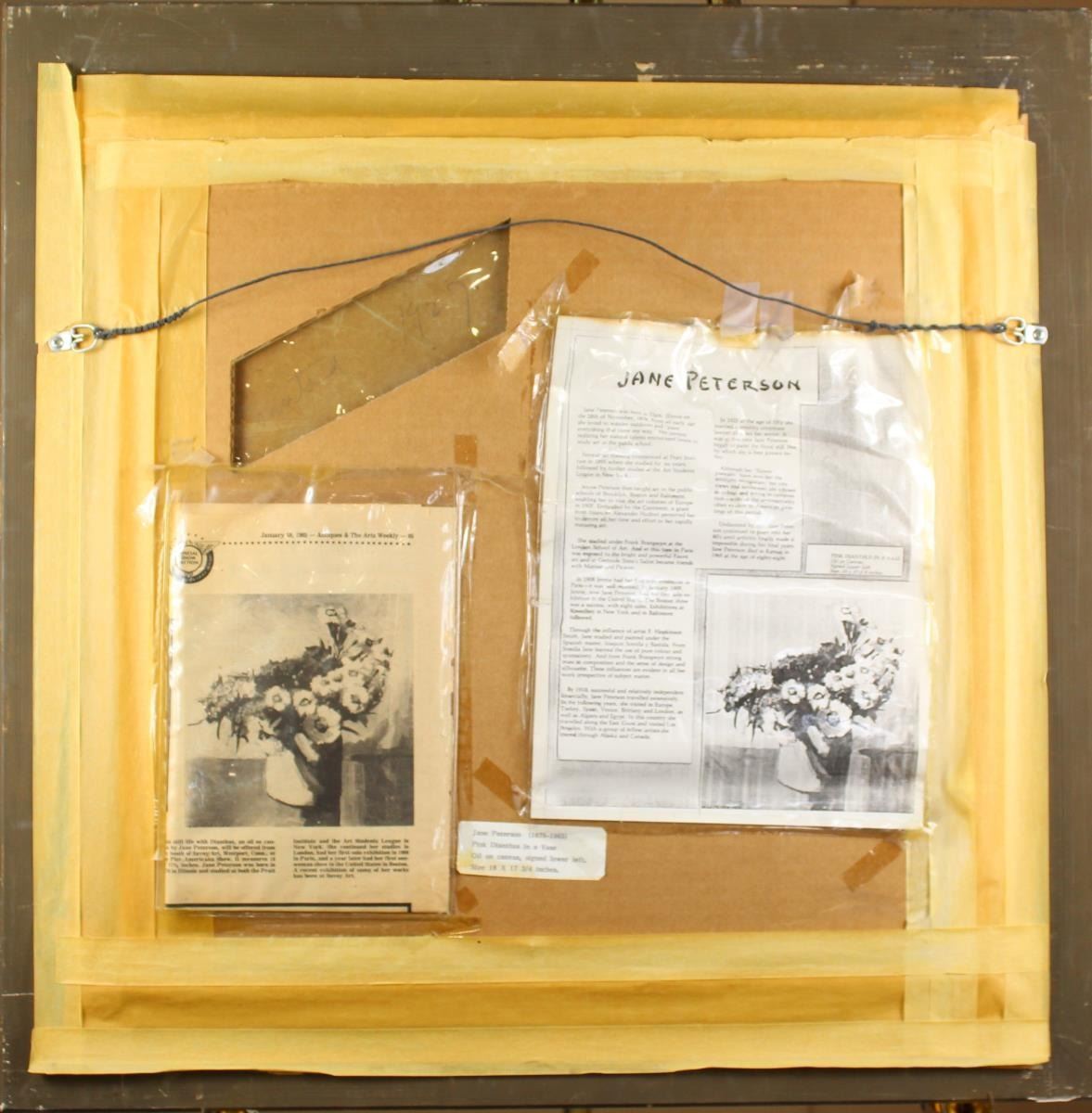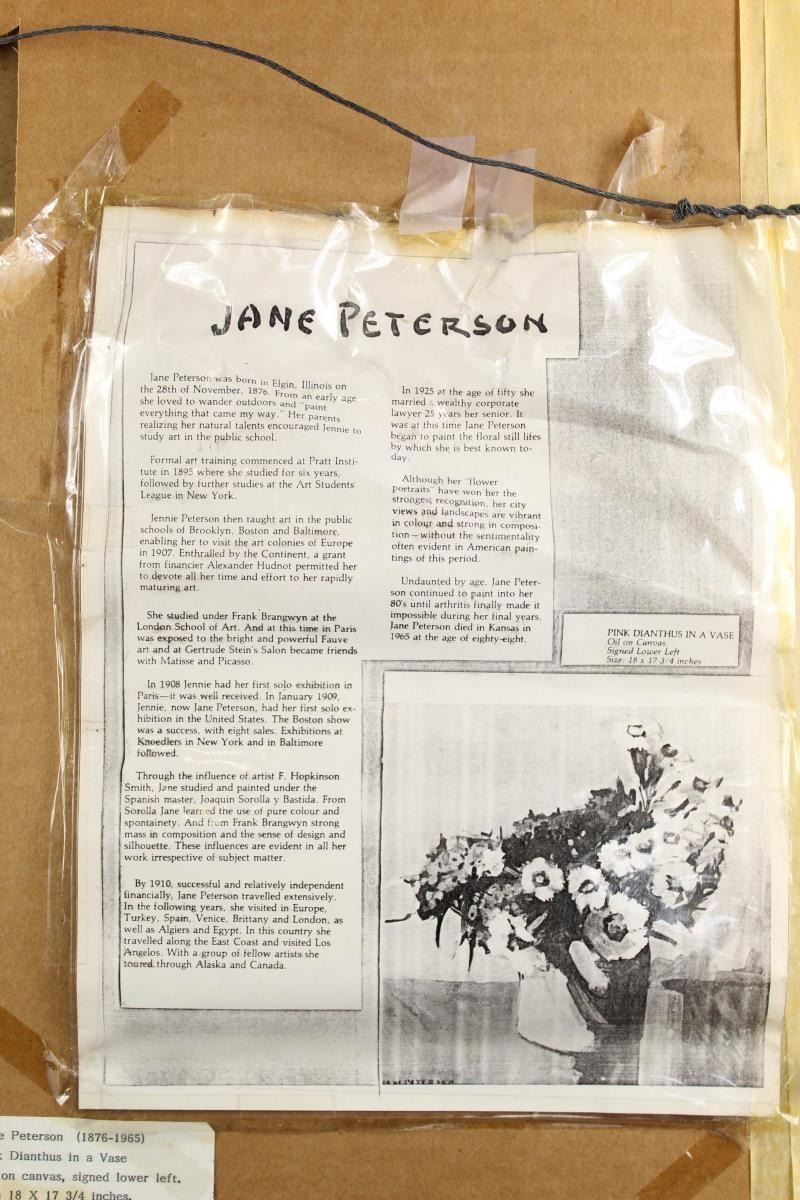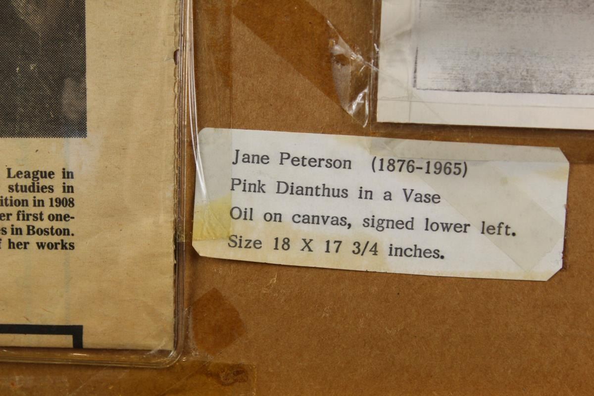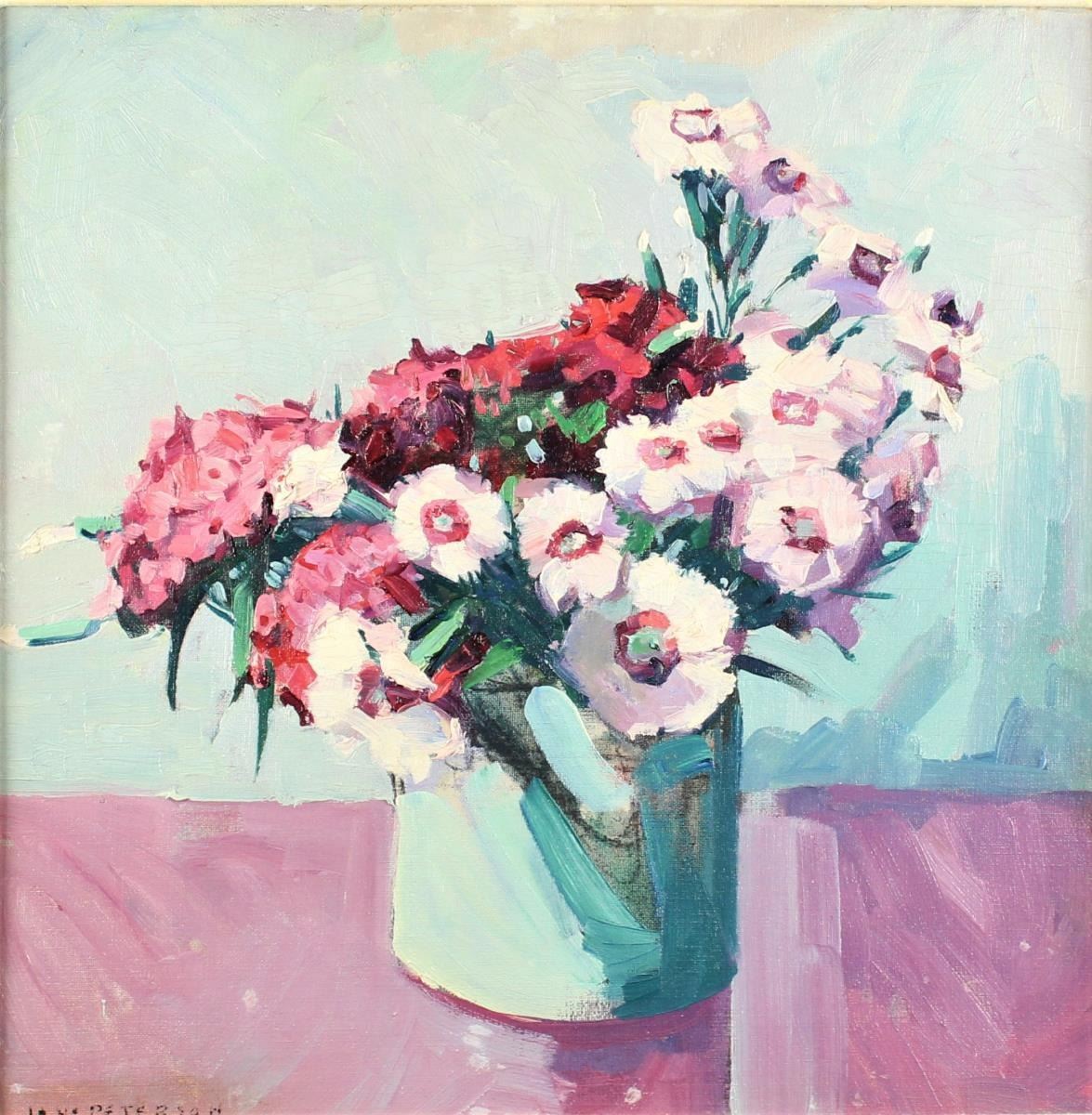 "Pink Dianthus in a Vase", exquisite floral still life, oil on canvas by Jane Peterson. It is signed in the lower left.
