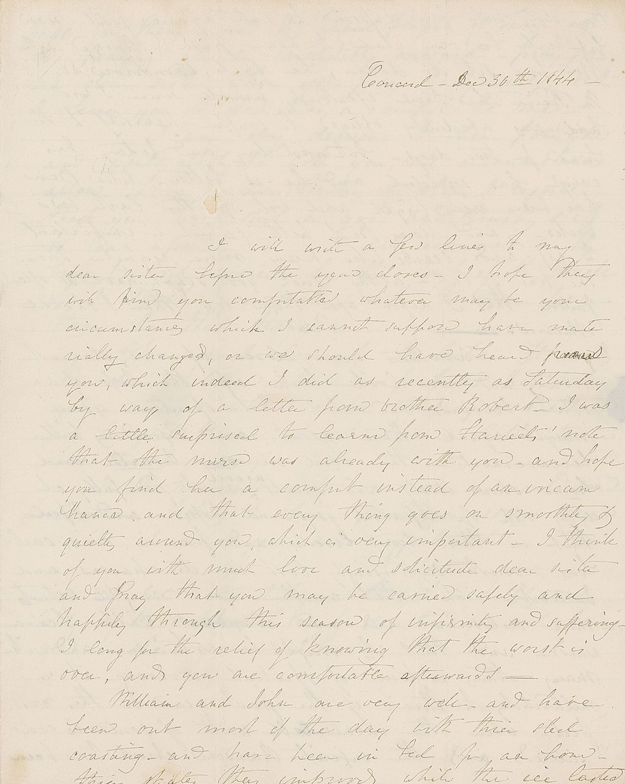 ALS signed “Jane,” three pages on two adjoining sheets, 7.75 x 9.75, December 30, 1844. Letter to her sister Mary Appleton Aiken, containing family news and gossip. In part: "I will write a few lines to my dear sister…I think of you with much love and solicitude dear sister and pray that you may be carried safely and happily through this season of infirmity and suffering. I long for the relief of knowing that the worst is over, and you are comfortable afterwards…William and John are very well, and have been out most of the day with their sled coasting…Mr. Pierce has been exceedingly unwell since I wrote…but yesterday and today his cough has yielded and he is better…Another year closes upon us, dearest sister, and we look back upon the loss of another beloved one—oh! that spiritual gain might equal these great and exceeding bitter bereavements…the rapid flight of time which is bearing so consistently onward —pray for me dear sister when you pray for yourself." Addressed on the integral leaf in Pierce's hand. In fine condition.