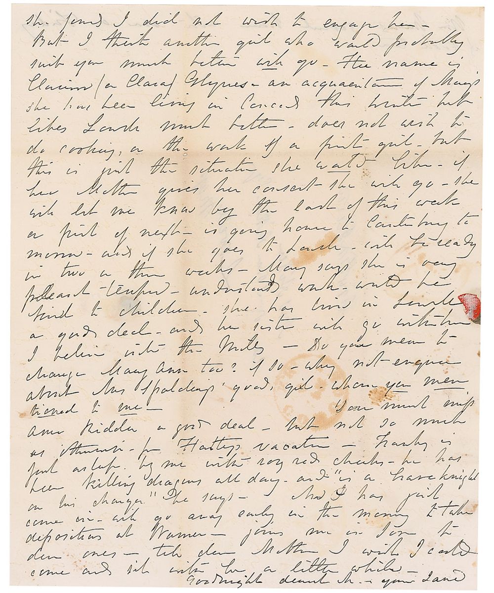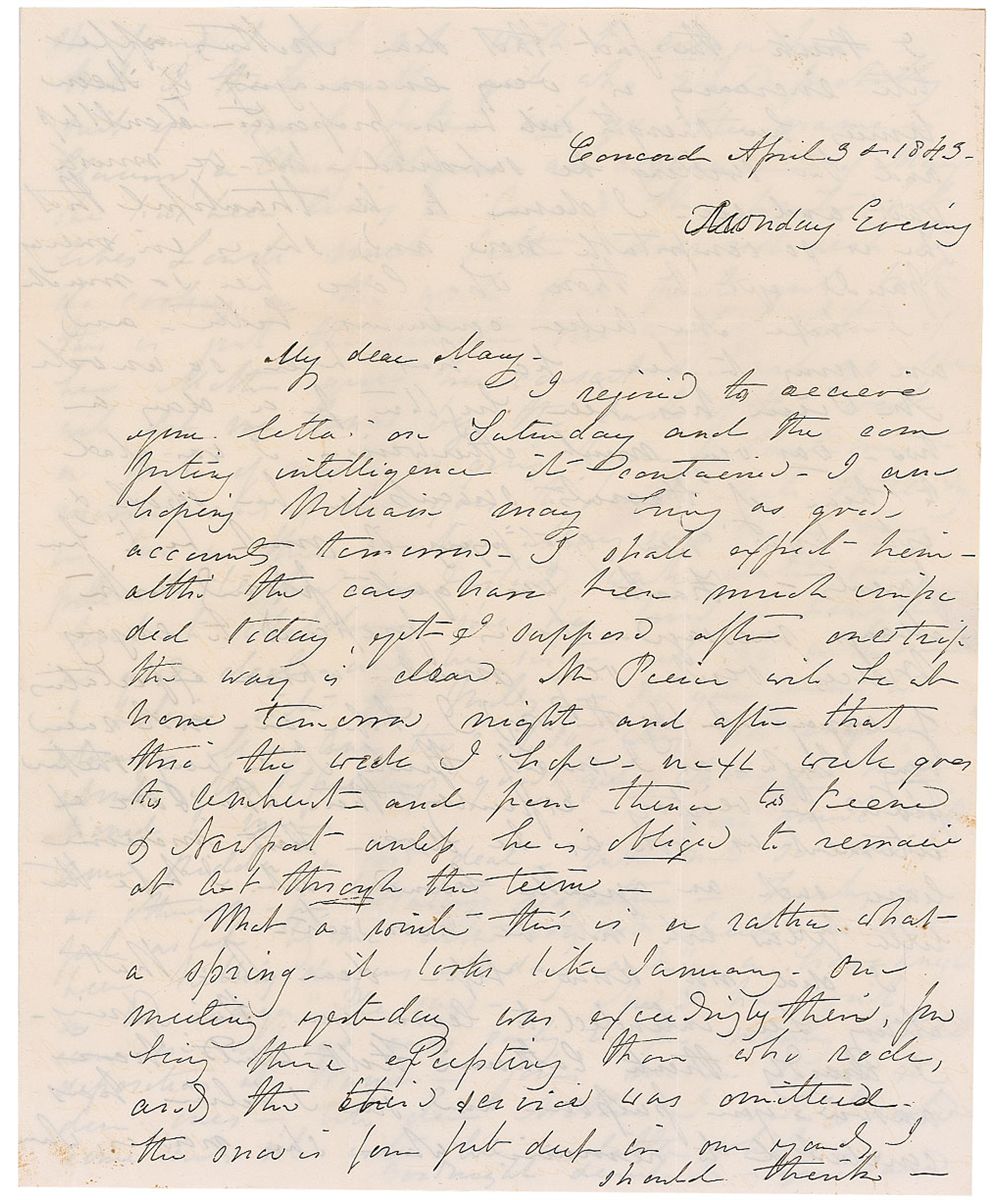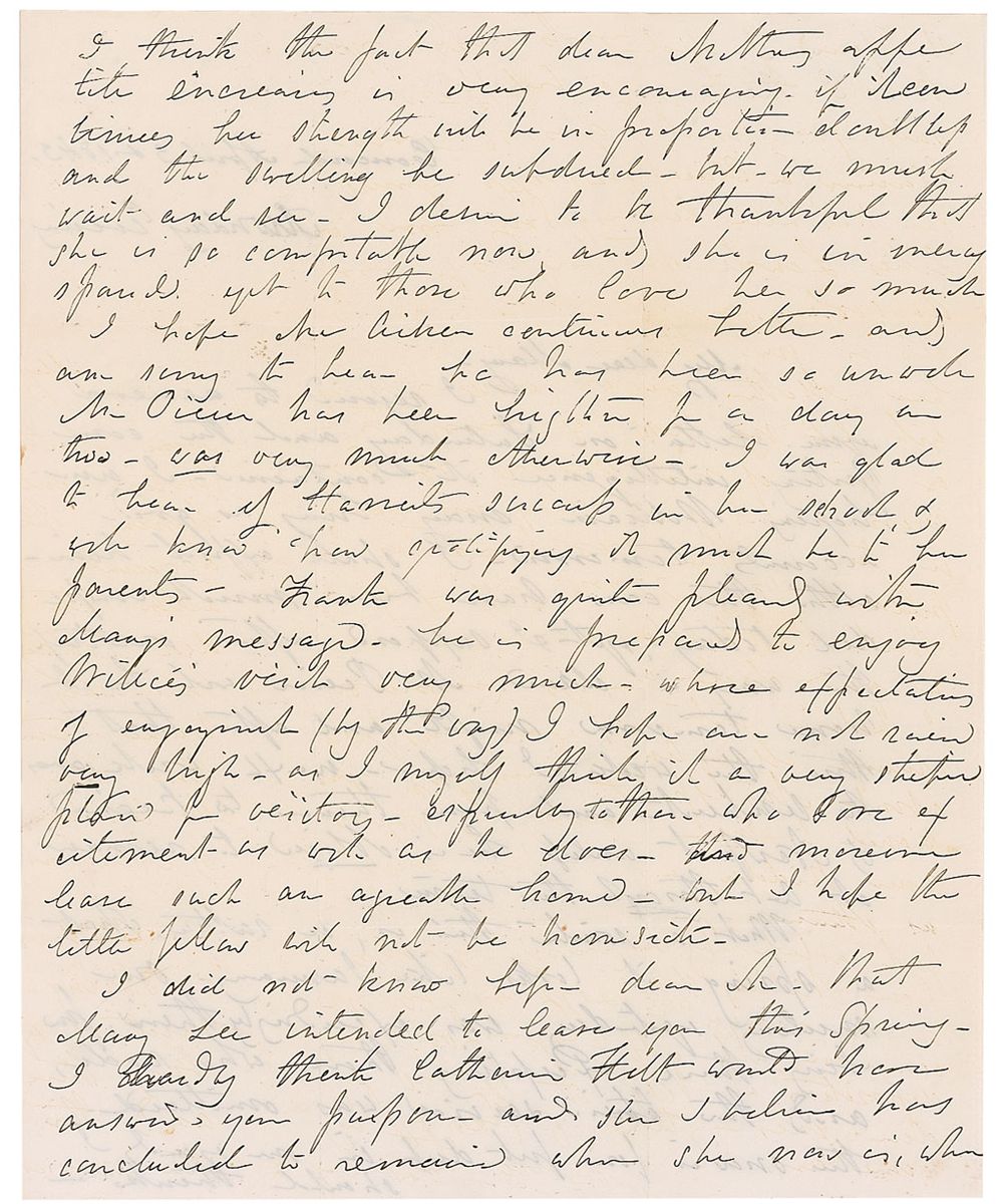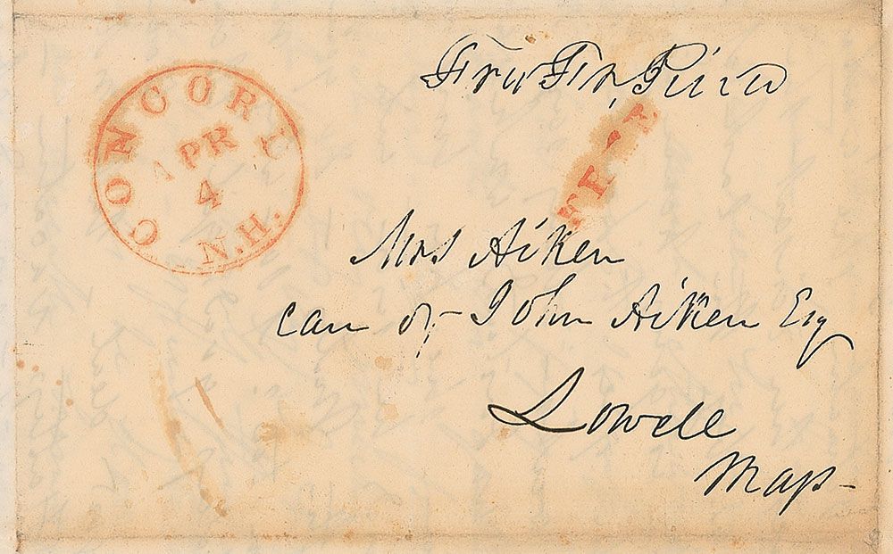 Uncommon ALS signed “Jane,” three pages on two adjoining sheets, 8 x 9.75, April 3, 1845. Lengthy letter to Mary Aiken. In part: “I rejoiced to receive your letter on Saturday and the …intelligence it contained. I am hoping William may bring as good accounts tomorrow. I shall expect him altho the cars have been much impeded today, yet I suppose after one trip the way is clear. Mr. Pierce will be at home tomorrow night and after that thru the week I hope…and then to Keene & Newport unless he is obliged to remain…through the term.” Reverse of second integral page bears an address panel in an unknown hand to “Mrs. Aiken, care of John Aiken Esq., Lowell, Mass,” and is franked in the upper right corner, “Free, Fr. Pierce.” In very good condition, with intersecting folds, uniform toning to franked panel, and some scattered light toning to last page of letter from postmark and “Free” stamp on reverse.