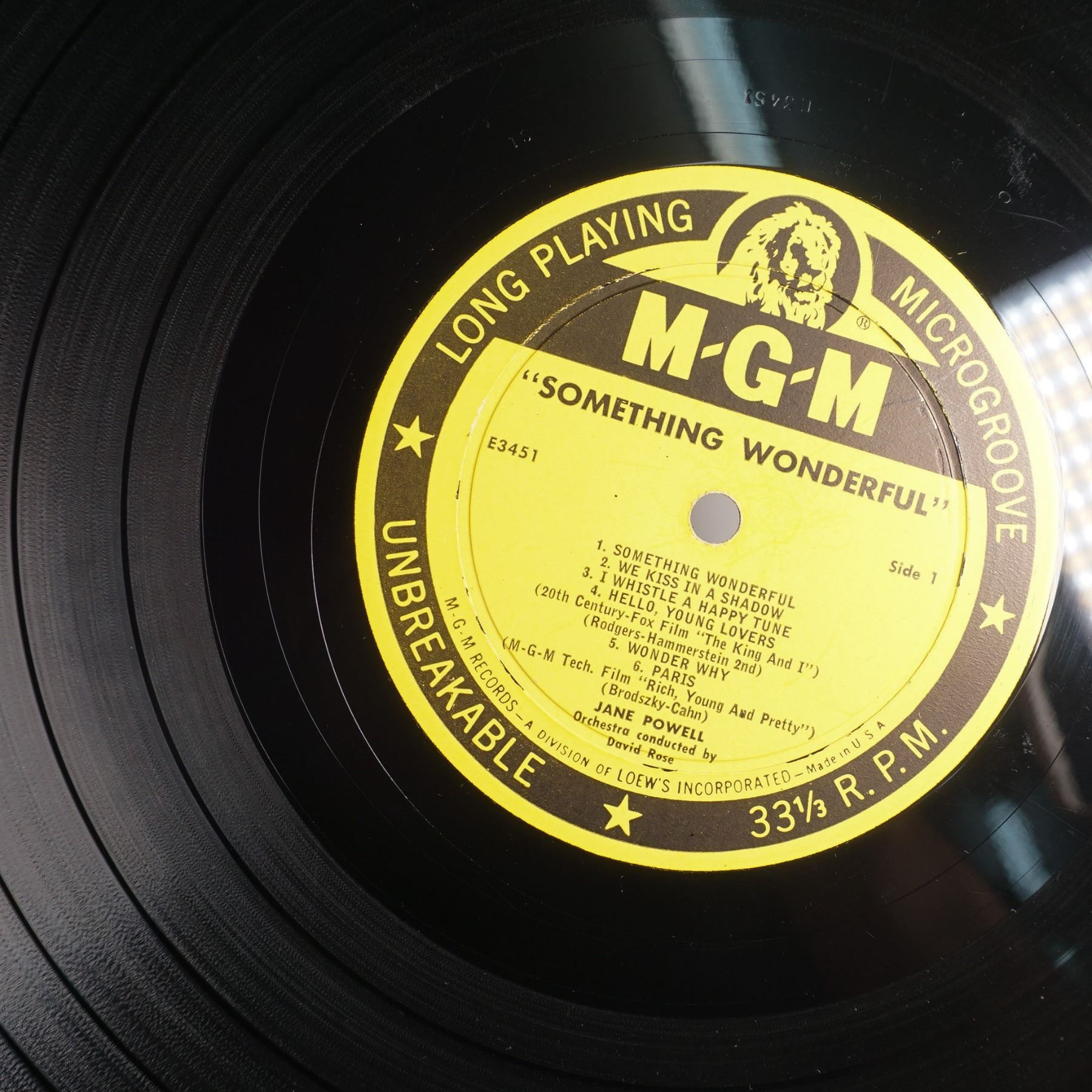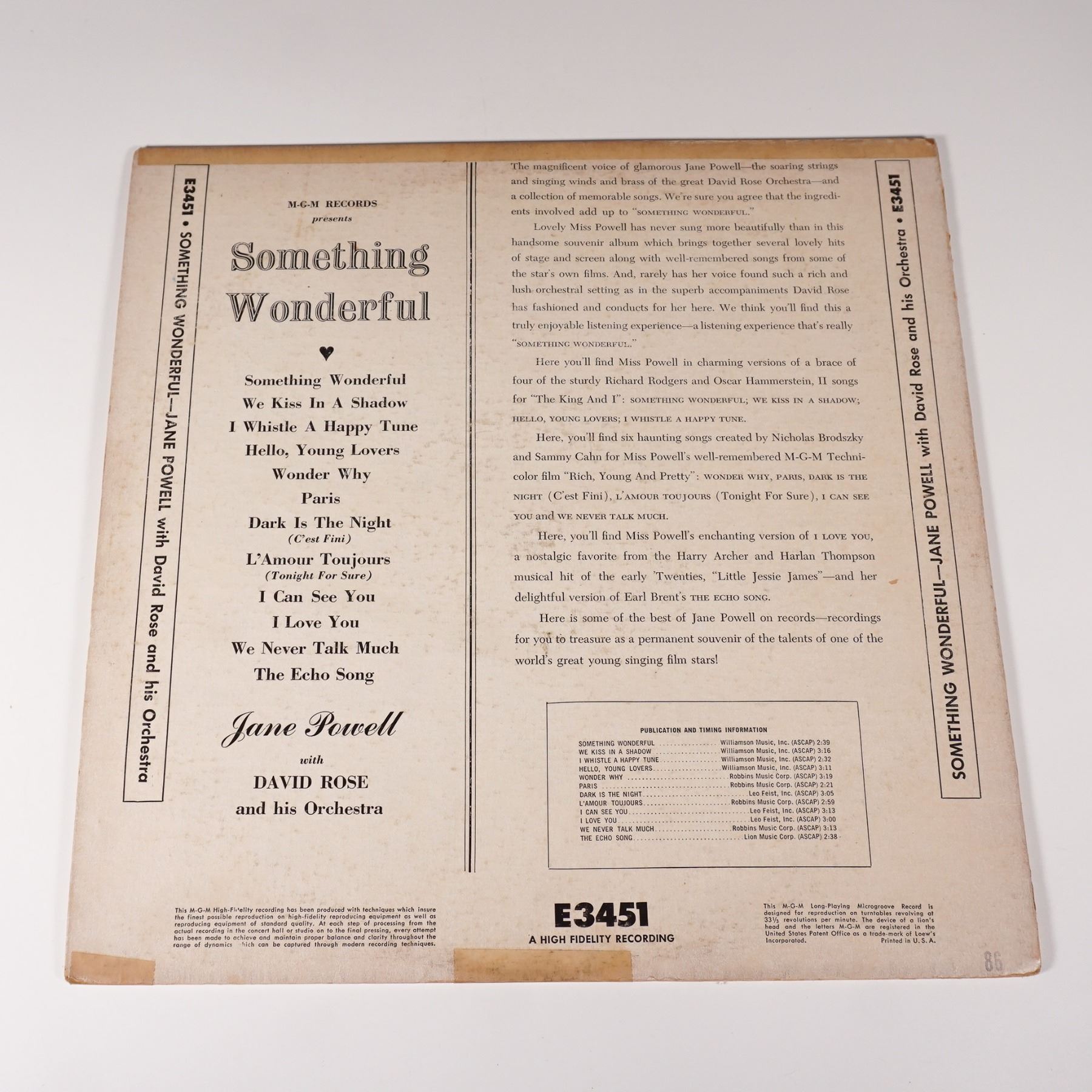 Released in 1958 by MGM Records in the United States, Something Wonderful showcases the charming and melodic voice of Jane Powell accompanied by the lush orchestral arrangements of David Rose and His Orchestra. Featuring a selection of timeless love songs, Broadway classics, and romantic ballads, Powell delivers captivating interpretations of standards such as We Kiss in a Shadow, I Whistle a Happy Tune, and Wonder Why. The album captures the golden-era sophistication of vocal jazz and traditional pop, enhanced by the polished orchestral backing. A standout release in Powell's recording career, this LP reflects the elegance and artistry of mid-century American music.