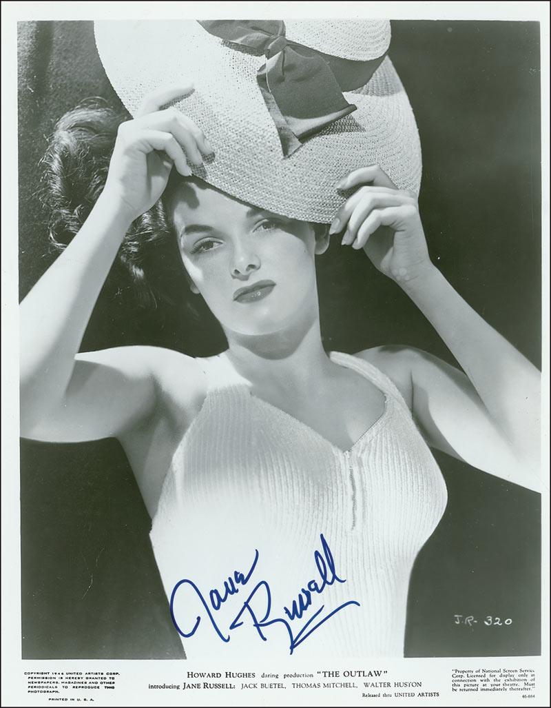 Sexy glossy 8 x 10 promotional photo for The Outlaw, signed in blue felt tip. Scattered creases and surface marks, otherwise fine condition.