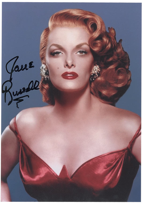 Sizzling color satin-finish 8 x 11.5 photo of Russell looking seductively at the camera, signed in black felt tip. Collector’s note on the reverse details when and where signature was acquired. In fine condition, with scattered surface impressions and trimmed edges.