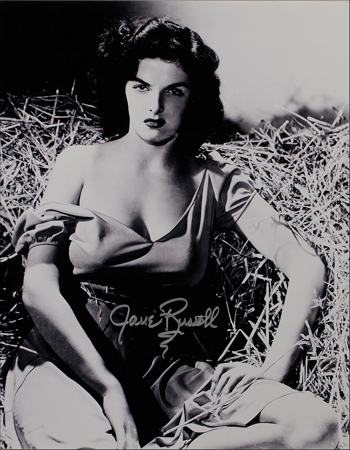 Scorching satin-finish 16 x 20 photo of Russell propped on a haystack with a shoulder bared, signed in silver ink. In fine condition.