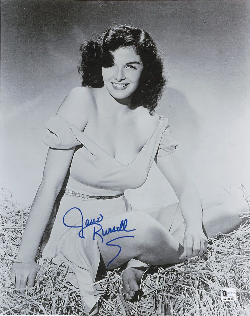 Glossy 10 x 12.5 photo of Russell as she appeared in The Outlaw, signed in blue felt tip. In fine condition.