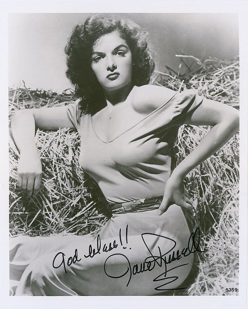 Classic glossy 8 x 10 photo of Russell as she appeared in The Outlaw, signed in black felt tip, “God Bless!! Jane Russell.” In very fine condition.