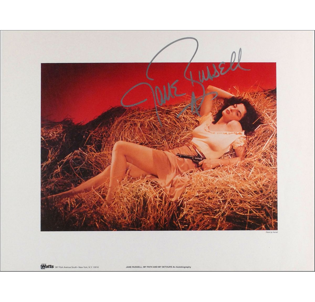 Color 18.5 x 14.5 poster featuring Russell as she appeared in The Outlaw, signed in silver ink. Rolled and in fine condition.