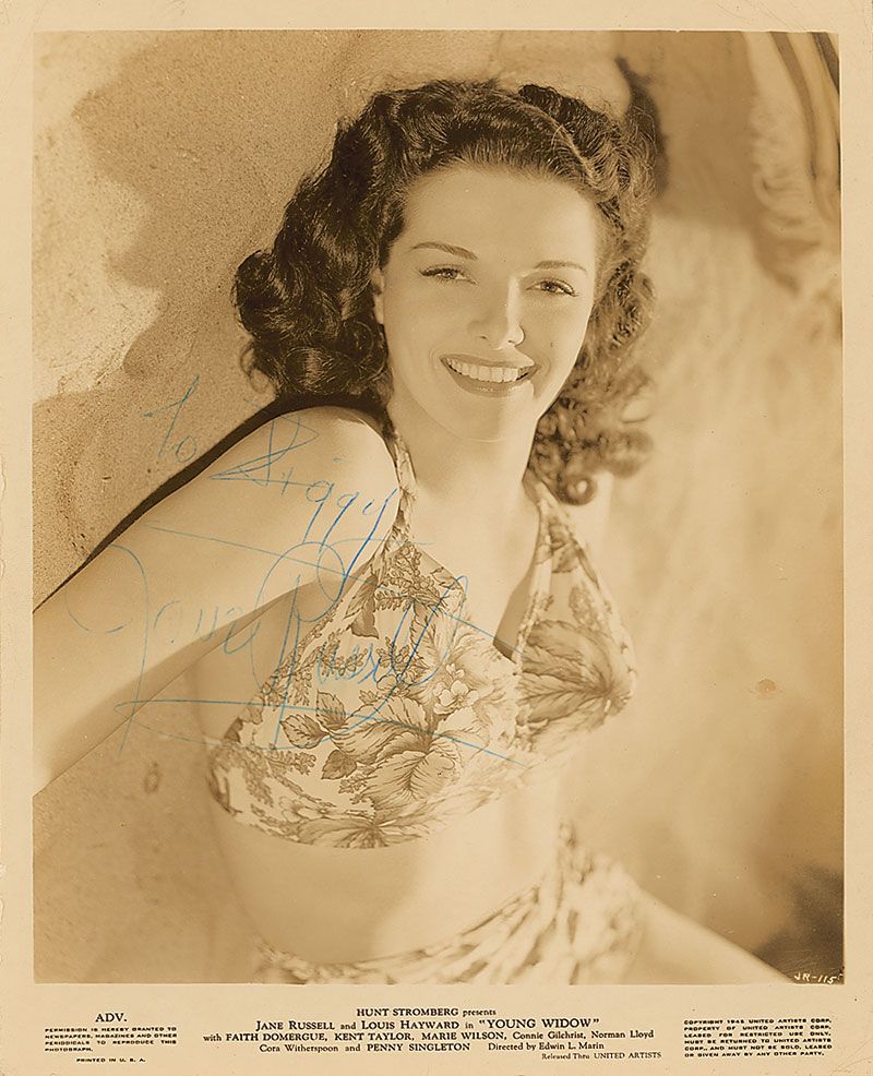 Attractive original glossy 8 x 10 publicity photo of Russell as she appeared in the 1946 film Young Widow, signed and inscribed in blue ballpoint, “To Ziggy, Jane Russell.” Creases to corners and skipping to ink at the start of her first name, otherwise fine condition.