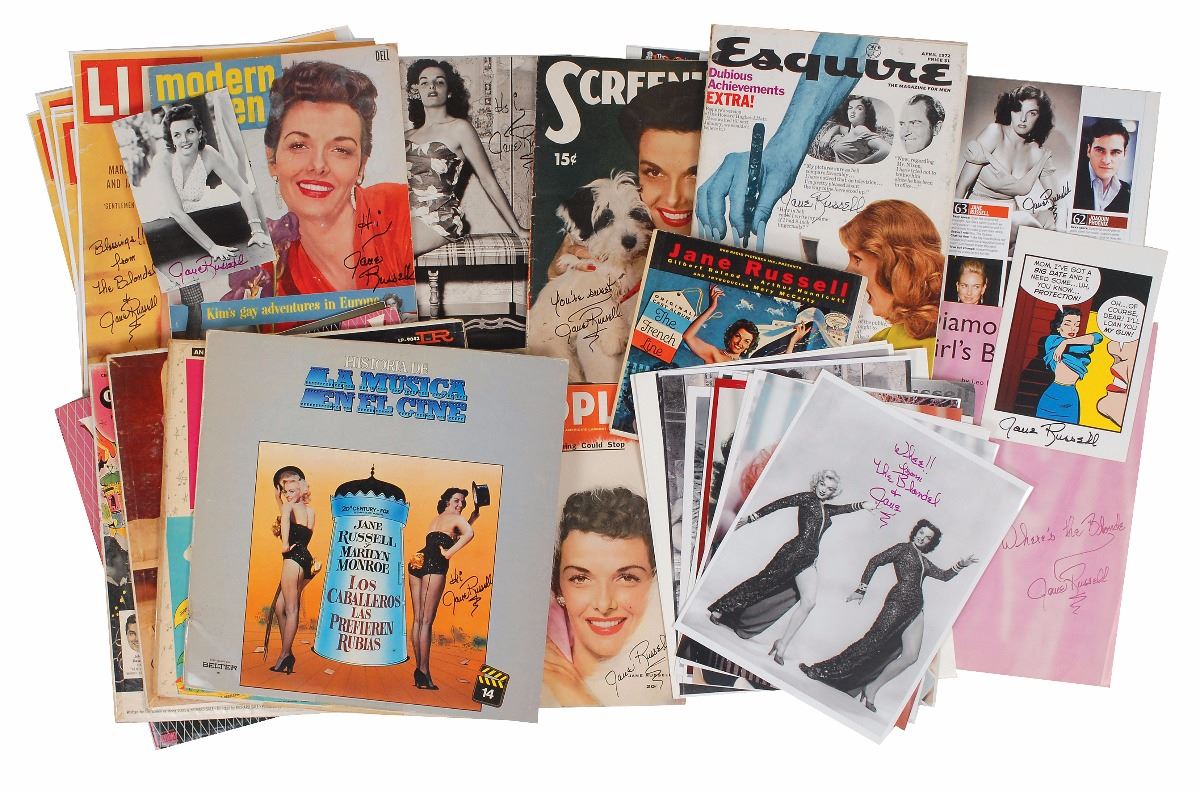 Collection of over ninety items, consisting of various color laserprint paperstock photos, record albums, and magazines signed by Russell: including six albums; two letters; eight magazines; a calendar; fifteen better quality glossy 8 x 10 photos; approximately forty-five color paperstock laserprint copies of various photos, magazines, and lobby cards, 11 x 14 and 14 x 11, several of which are signed twice; eleven color paperstock laserprint copies of 8 x 10 photos; four smaller copies of photos; two postcards; and a program. In overall very good to fine condition.820