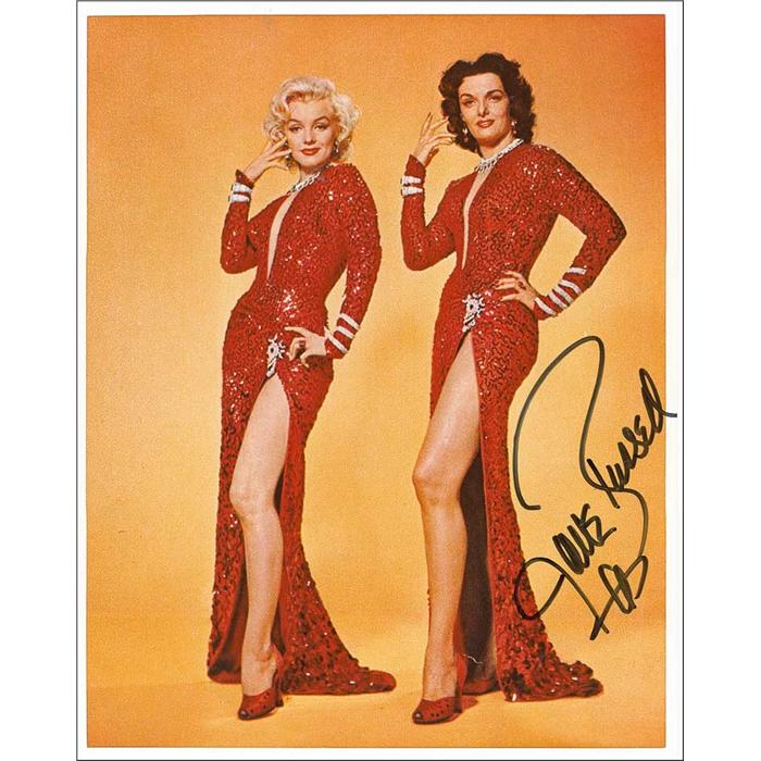 Color glossy 8 x 10 photo of Russell and Marilyn Monroe in matching red sequined dresses, signed in black felt tip by Russell. In very fine condition. Pre-certified PSA/DNA and RRAuction COA.